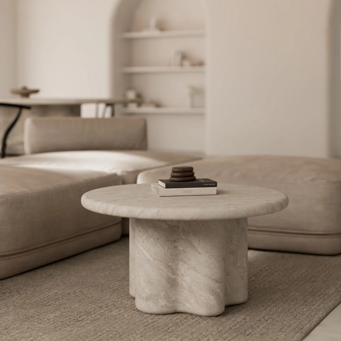 La mesa de centro LUIGI destaca por su diseño elegante y refinado, que combina la fuerza del cemento-GFRC (reforzado con fibra de vidrio) con la delicadeza visual del efecto mármol travertino. Esta combinación de materiales otorga a la pieza un carácter escultórico que captura la atención sin necesidad de excesos decorativos.
