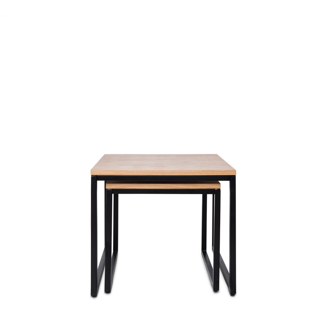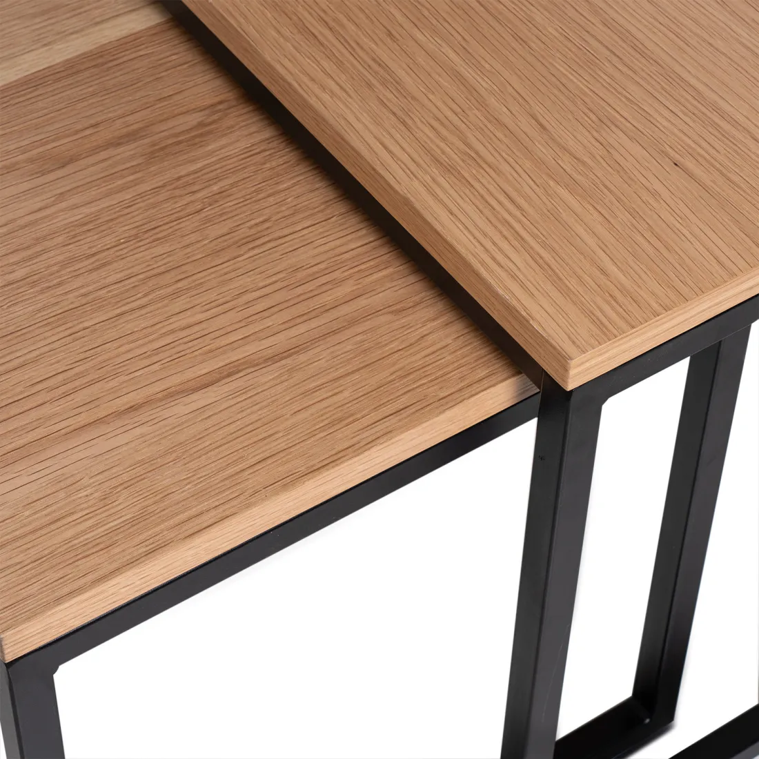 El set de mesas auxiliares PIERO destaca por su equilibrio entre la calidez de la madera y la solidez del metal, ofreciendo una estética sofisticada y atemporal. Cada mesa presenta una tapa cuadrada elaborada en chapa de roble, sosteniéndose sobre patas de metal lacado en negro, un contraste de materiales que realza su estilo contemporáneo con un sutil guiño industrial.