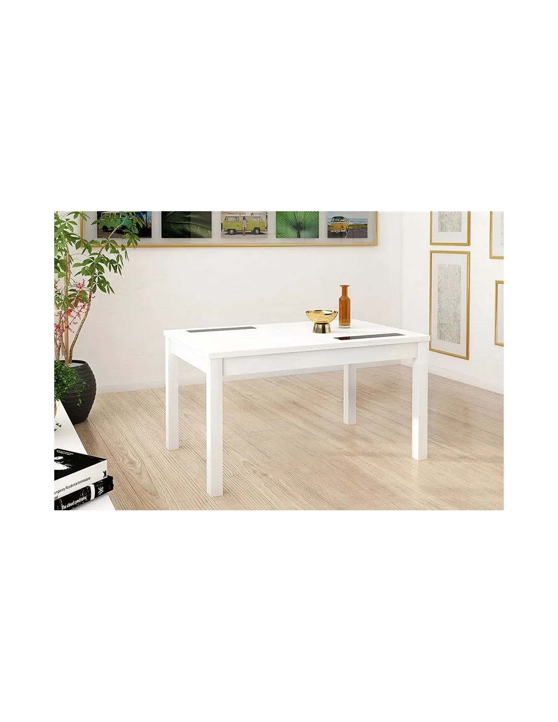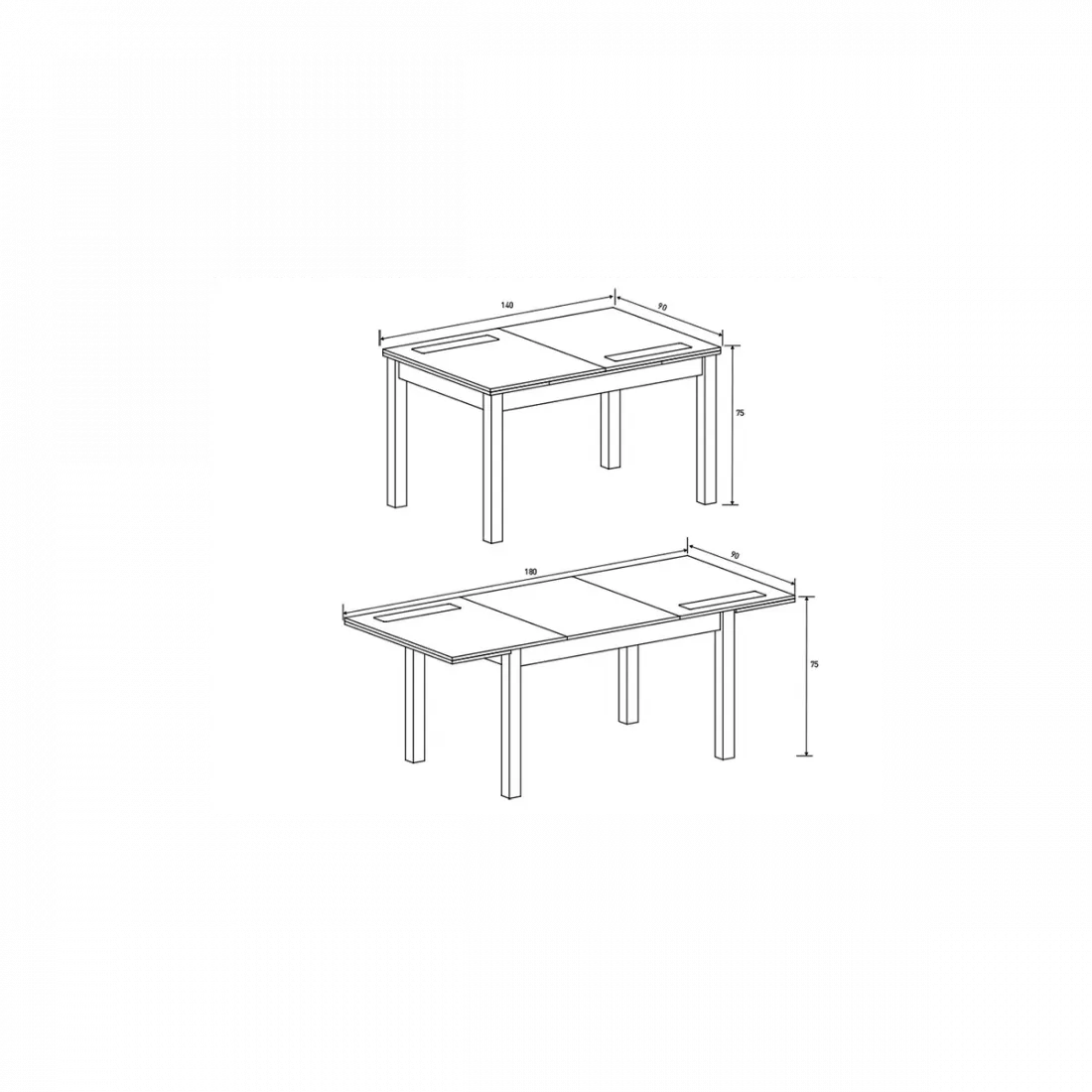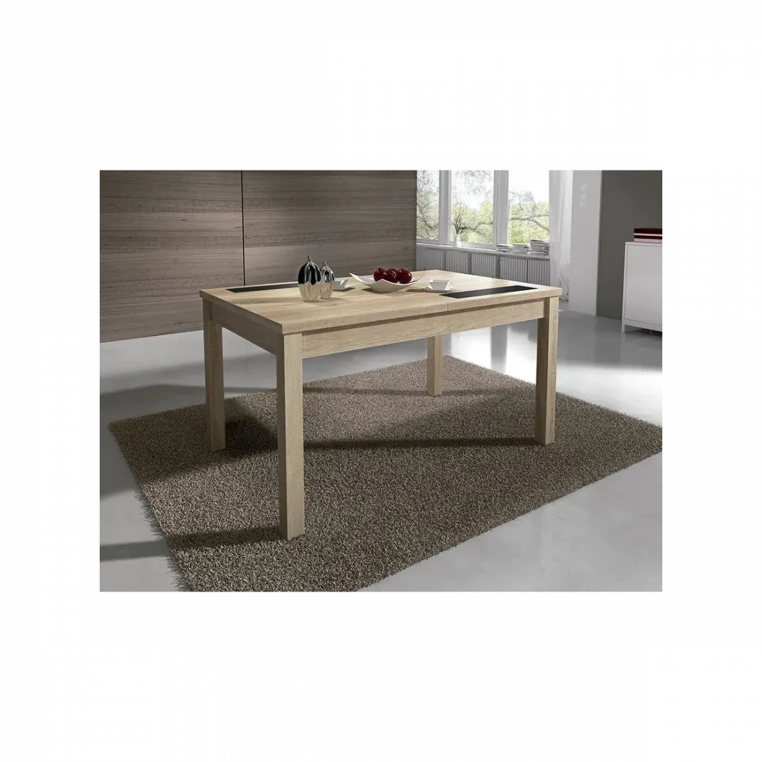 Mesa 140x90 extensible a 180x90 cm. modelo Lara, color cambria o blanco con cristales siempre negro. SISTEMA DE APERTURA CENTRAL.