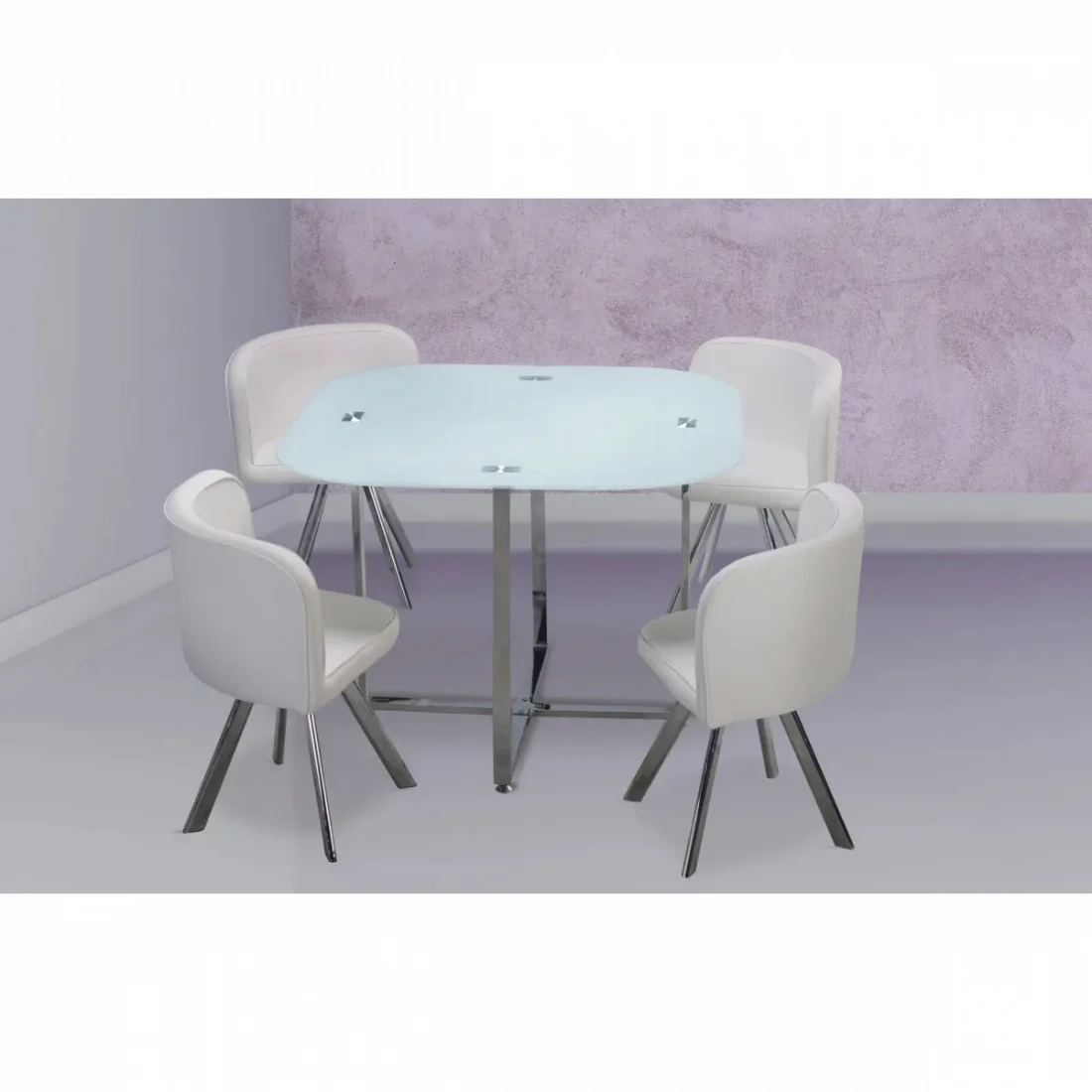La mesa de comedor cuenta con un diseño moderno, con un tablero hecho de cristal templado en color Blanco de gran resistencia. Su estructura y patas están hechas de metal cromado logrando una gran combinación y estabilidad.
