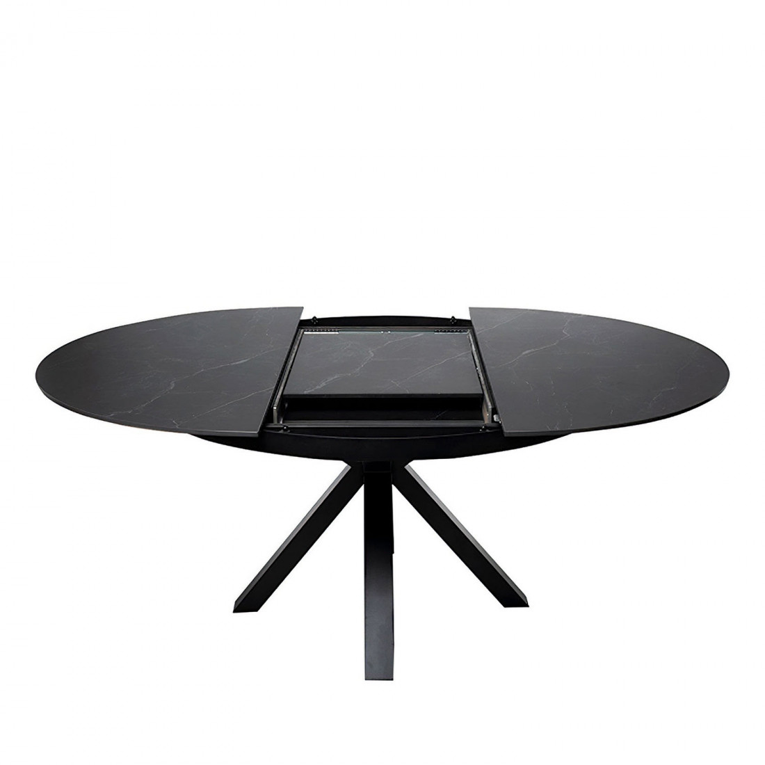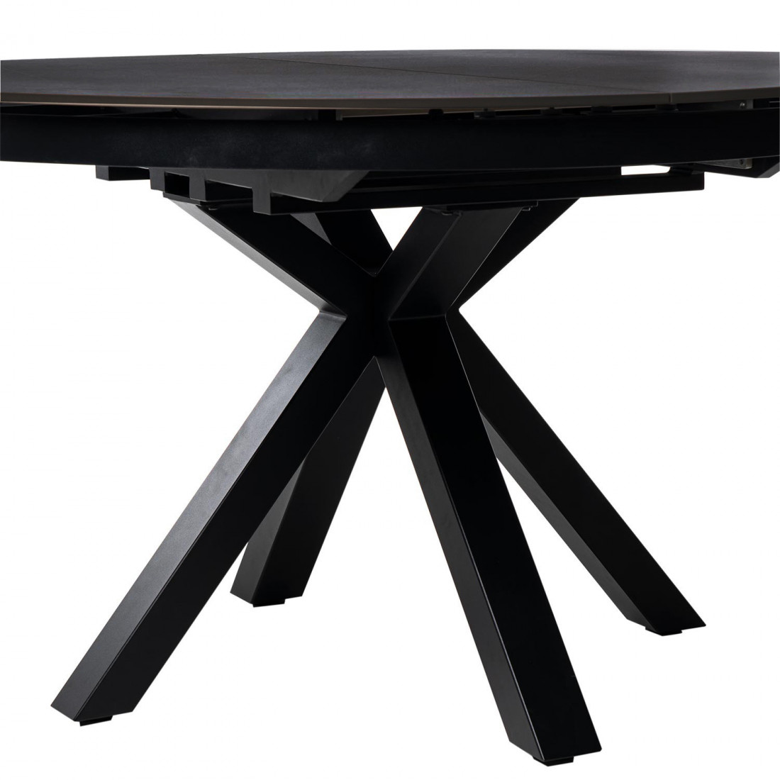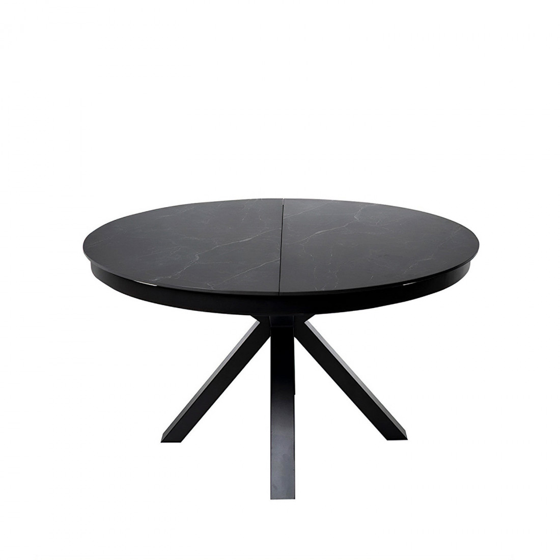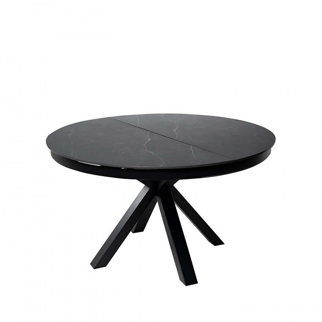 La mesa TRACY destaca por su diseño escultórico y sofisticado. Su tapa redonda de porcelánico efecto travertino, de 120 cm de diámetro y 11 mm de grosor, aporta una estética elegante y atemporal, ideal para espacios modernos o contemporáneos.