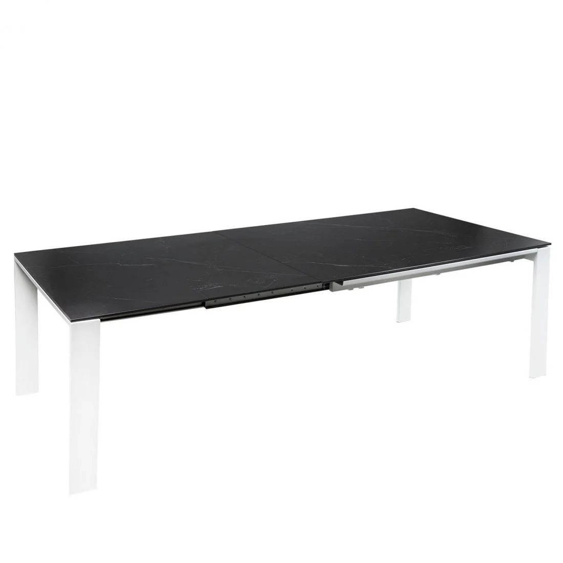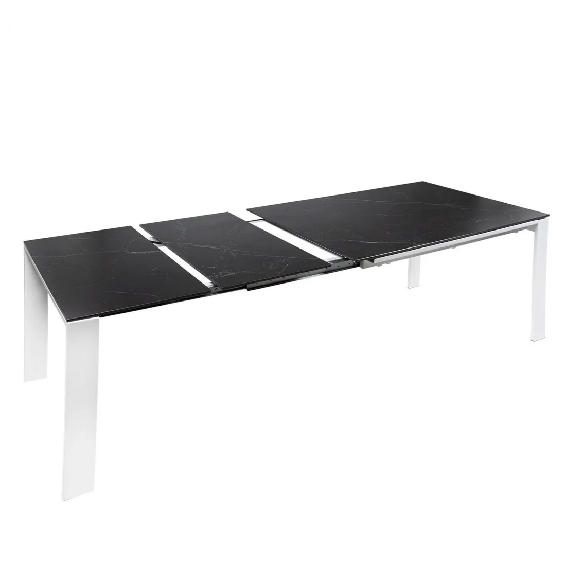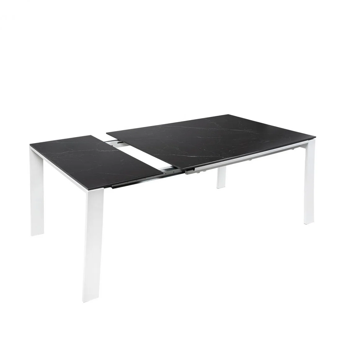 La tapa de porcelánico de 10 mm, disponible en tonos blanco, gris o negro, aporta una estética refinada y una resistencia superior al uso diario, al calor y a los arañazos. Sus patas metálicas, completan una silueta moderna y minimalista que encaja tanto en ambientes contemporáneos como en espacios más sobrios.