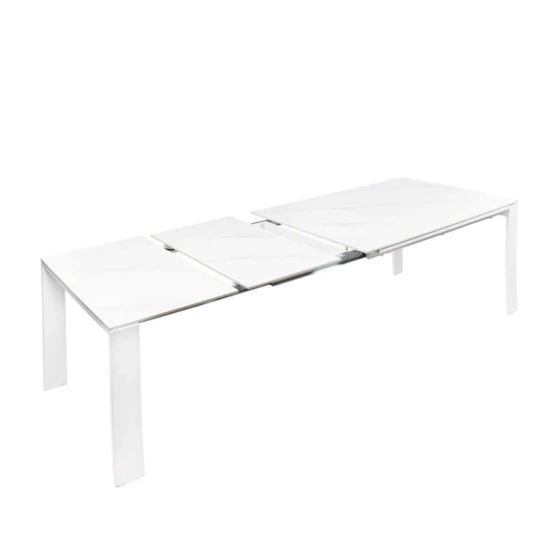 La tapa de porcelánico de 10 mm, disponible en tonos blanco, gris o negro, aporta una estética refinada y una resistencia superior al uso diario, al calor y a los arañazos. Sus patas metálicas, completan una silueta moderna y minimalista que encaja tanto en ambientes contemporáneos como en espacios más sobrios.