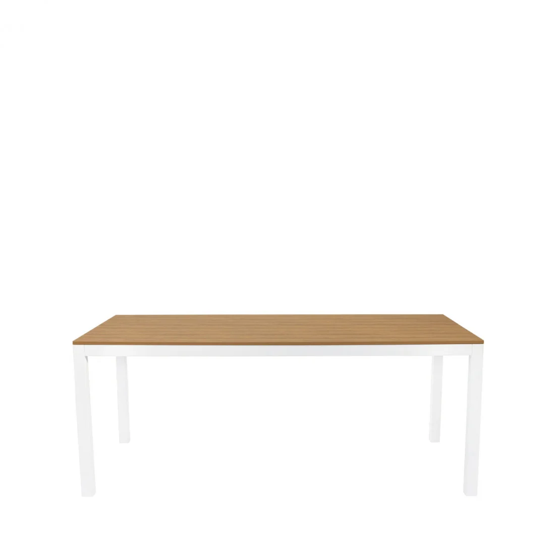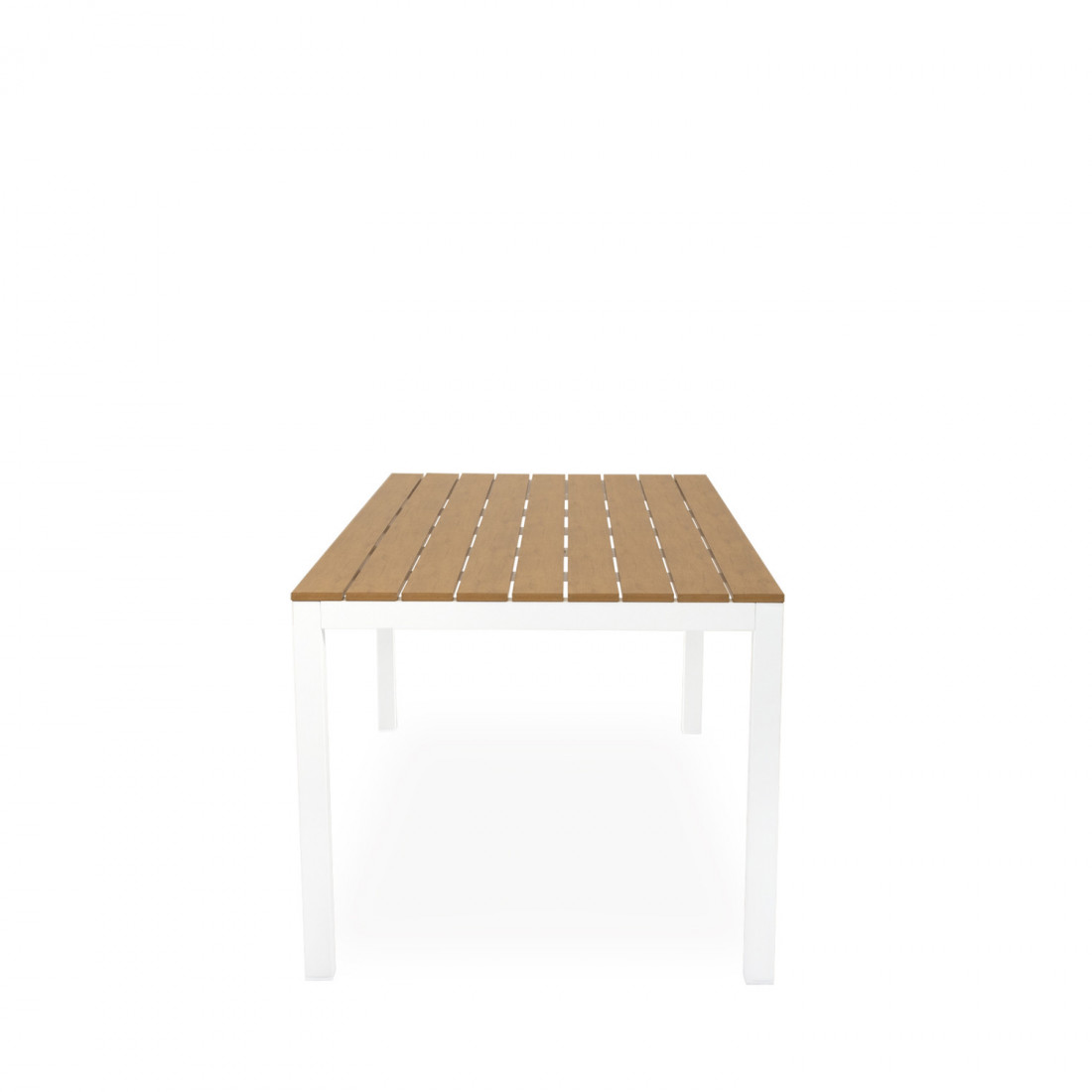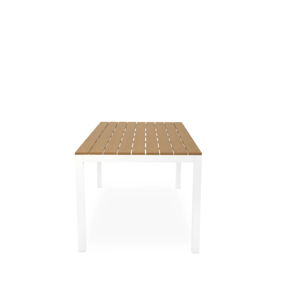 Su tapa está compuesta por tablones de polimadera en acabado natural, que evocan la calidez de la madera pero con la ventaja de ser un material prácticamente libre de mantenimiento, resistente a la intemperie y fácil de limpiar.