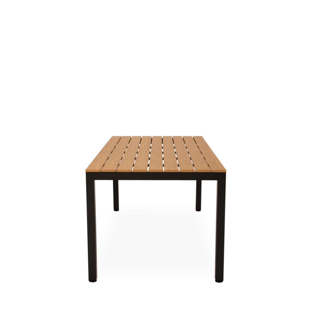 Su tapa está compuesta por tablones de polimadera en acabado natural, que evocan la calidez de la madera pero con la ventaja de ser un material prácticamente libre de mantenimiento, resistente a la intemperie y fácil de limpiar.