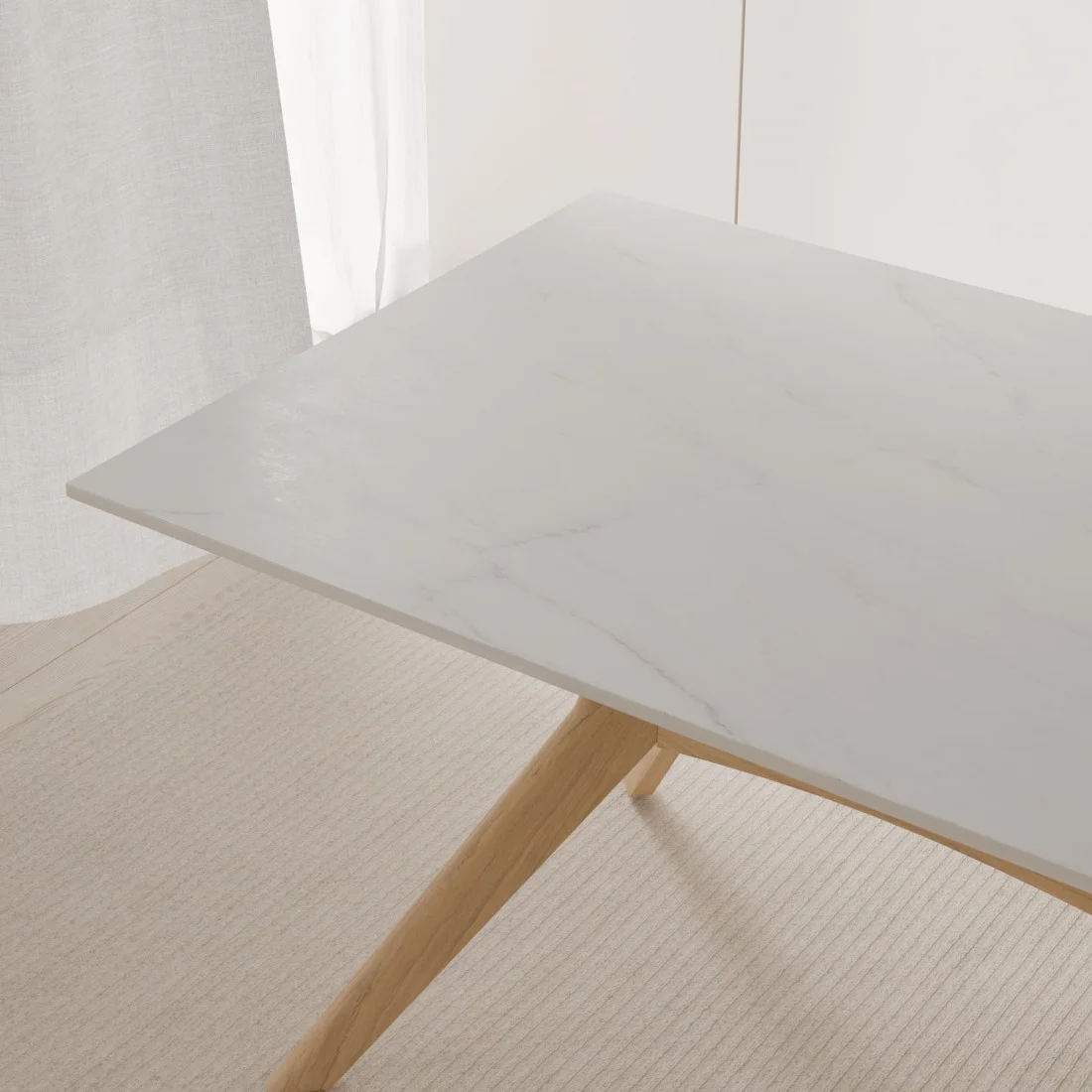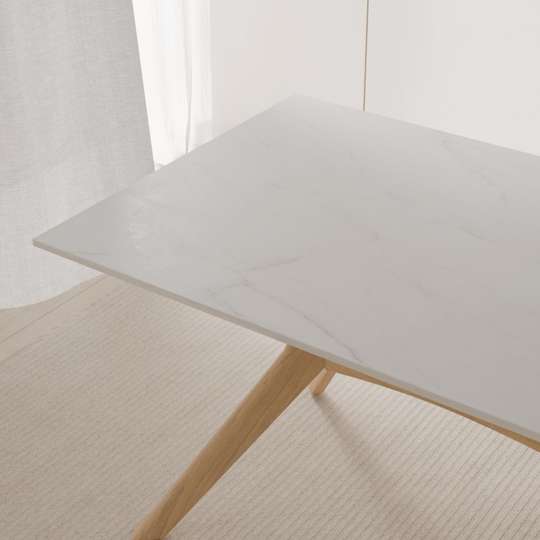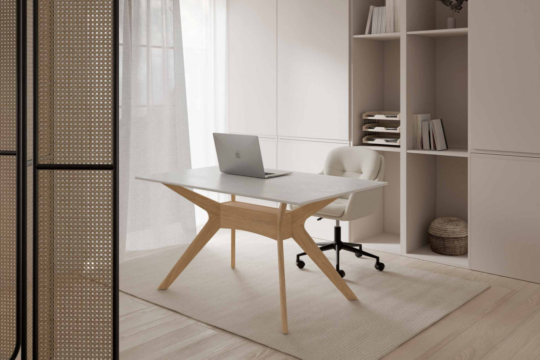 Las patas de madera de hevea en acabado roble, aportan calidez y estabilidad, creando un contraste armónico con la textura suave y minimalista del porcelánico. Disponible en medidas de 140 y 160 cm, ELOISE encaja a la perfección tanto en comedores compactos como en ambientes más amplios donde se busca destacar con una pieza funcional y con carácter.