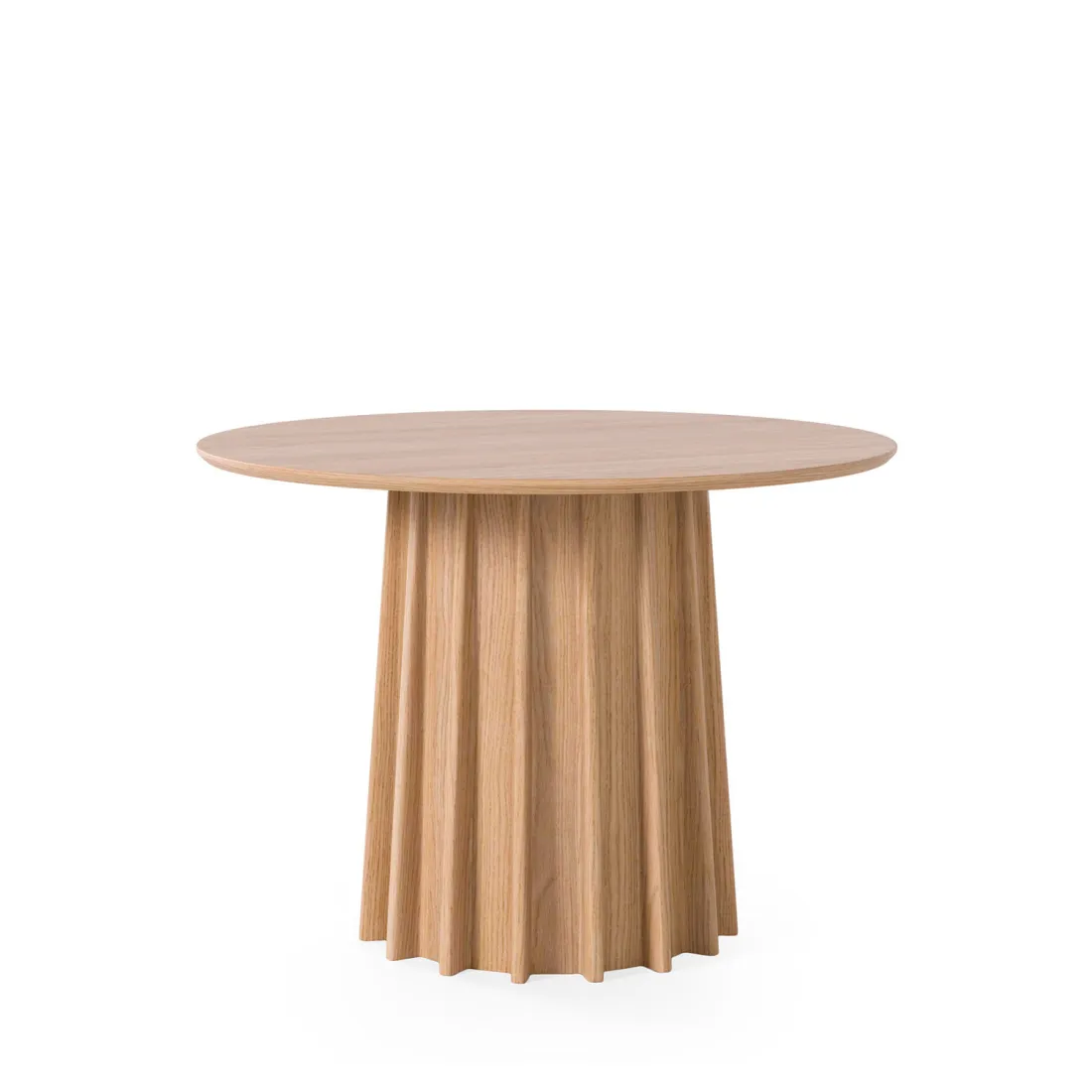 El tablero, de forma circular y amplia, es de 2 cm de grosor y está elaborado en chapa de roble. La base, por su parte, es completamente distintiva, con pliegues marcados en la chapa de roble que le confieren una estética...