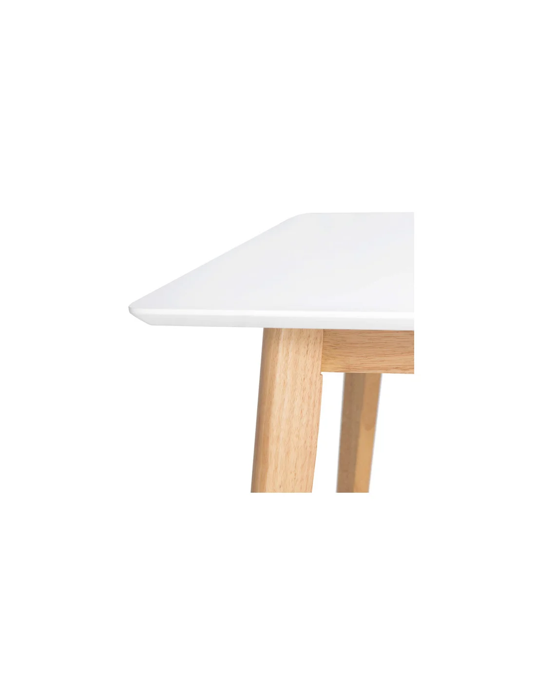 Con líneas limpias y una presencia más generosa, la mesa MARIE 140 aporta amplitud sin perder la esencia de un diseño equilibrado y actual. Su sobre rectangular de 2 cm de grosor, fabricado en MDF lacado blanco, refleja una estética depurada y luminosa que armoniza perfectamente con sus patas de madera maciza en tono roble claro, ligeramente inclinadas para añadir dinamismo visual.