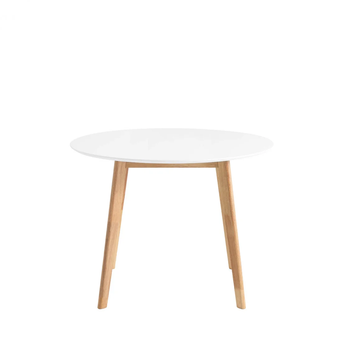 Con una silueta redonda, esta mesa resulta ideal tanto para comedores pequeños como para cocinas donde cada detalle cuenta. La fusión del blanco mate con el veteado sutil del roble crea una armonía cromática que encaja a la perfección en espacios de inspiración nórdica o escandinava.
