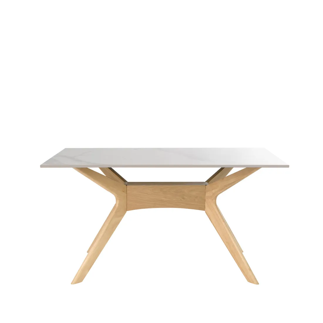 Las patas de madera de hevea en acabado roble, aportan calidez y estabilidad, creando un contraste armónico con la textura suave y minimalista del porcelánico. Disponible en medidas de 140 y 160 cm, ELOISE encaja a la perfección tanto en comedores compactos como en ambientes más amplios donde se busca destacar con una pieza funcional y con carácter.