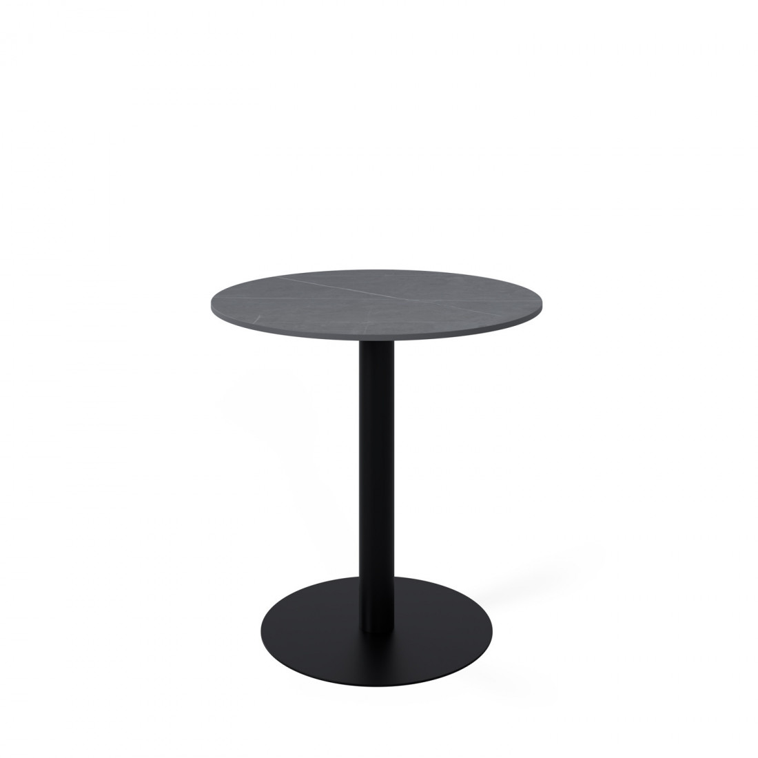 Su tapa redonda de porcelánico, de 70 cm de diámetro y 12 mm de grosor, está disponible en tres tonos neutros —blanco, negro y gris— que realzan su carácter sobrio y atemporal.