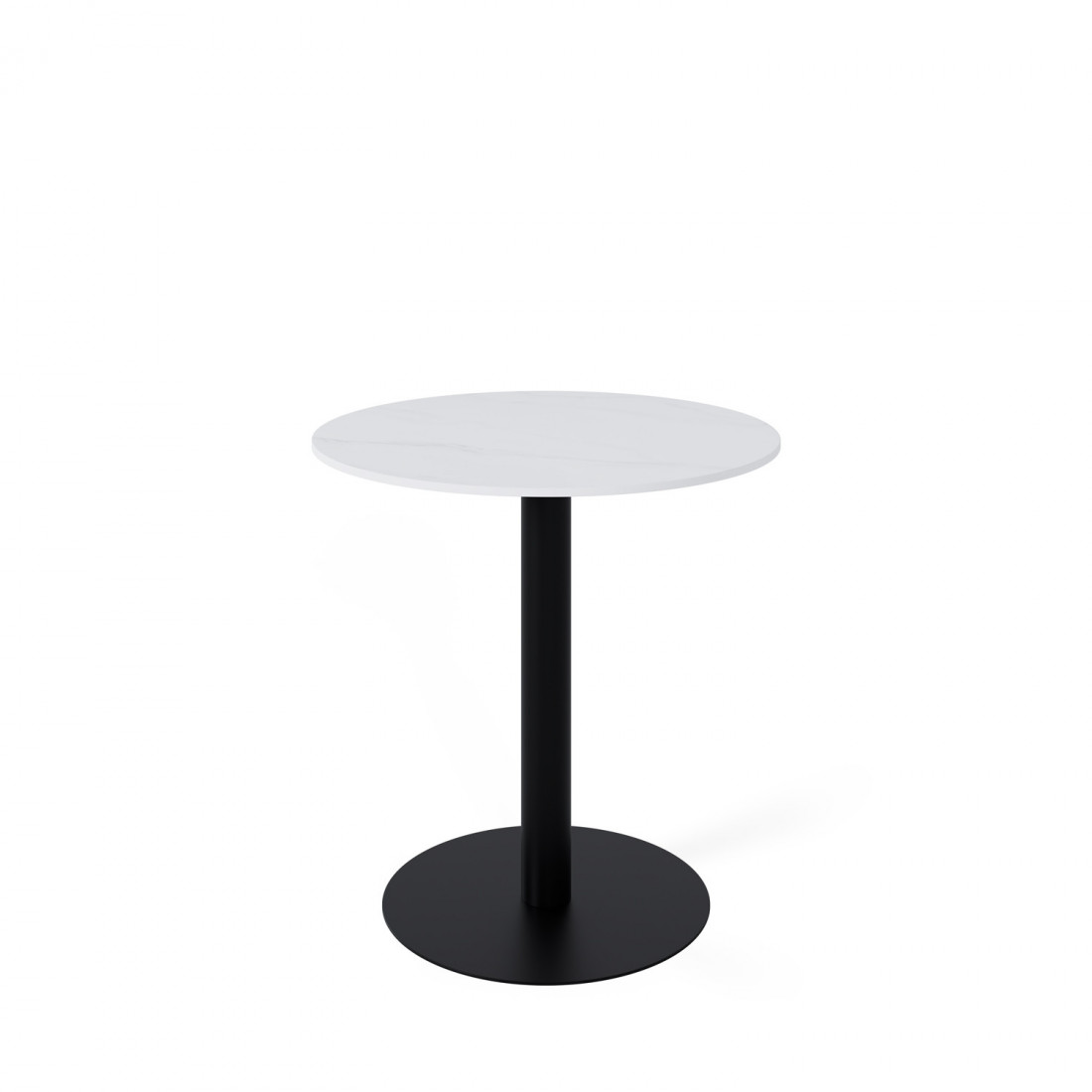 Su tapa redonda de porcelánico, de 70 cm de diámetro y 12 mm de grosor, está disponible en tres tonos neutros —blanco, negro y gris— que realzan su carácter sobrio y atemporal.
