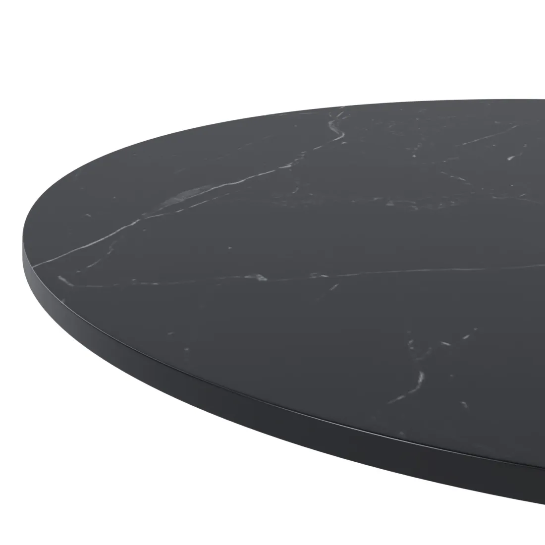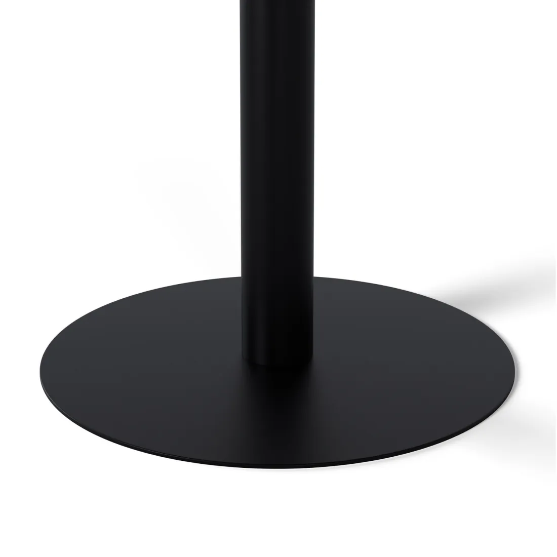 Su tapa redonda de porcelánico, de 70 cm de diámetro y 12 mm de grosor, está disponible en tres tonos neutros —blanco, negro y gris— que realzan su carácter sobrio y atemporal.