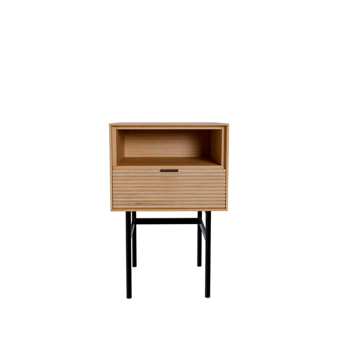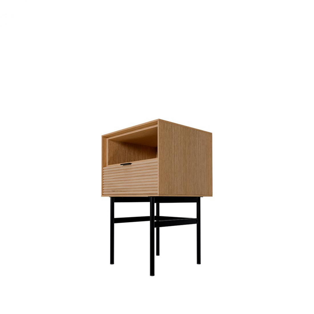 Fabricada en chapa de roble con frente en madera maciza rayada, destaca por sus acabados cuidados y detalles metálicos en negro. El sistema soft closing asegura una experiencia de uso suave y silenciosa.