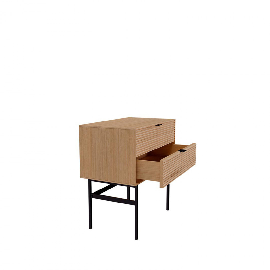 Su estructura en chapa de roble y frentes en madera maciza rayada aportan textura y naturalidad, mientras que los detalles metálicos en negro y el sistema soft closing aseguran comodidad y estilo en el uso diario.
