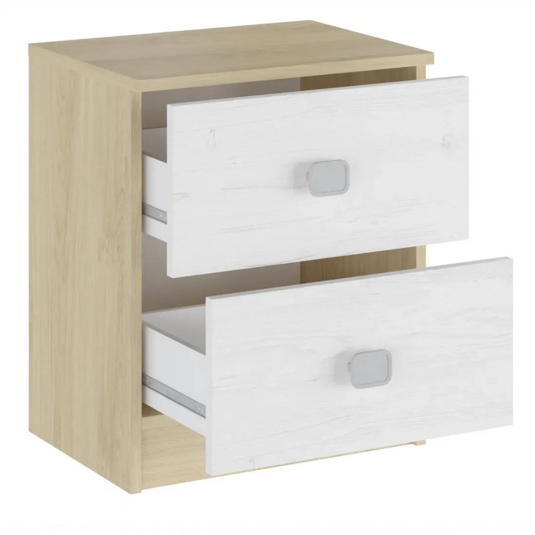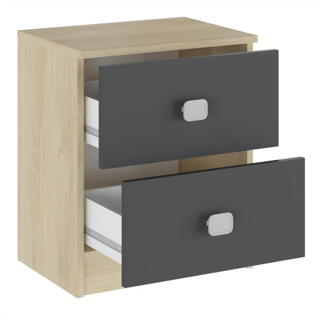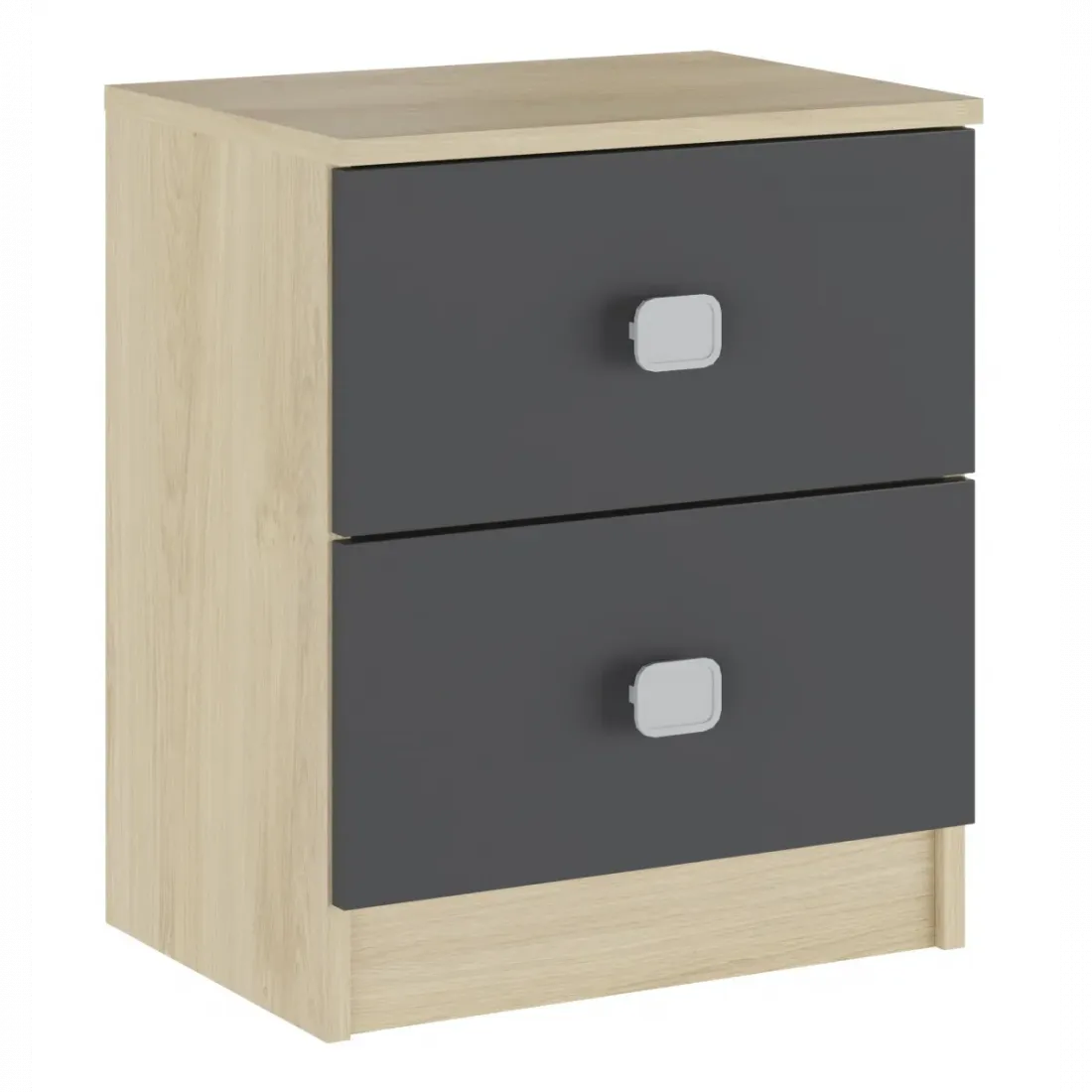 Mesita de noche con 2 cajones en acabado blanco con frentes en grafito, es un modelo que encajará perfectamente con el resto de decoración.