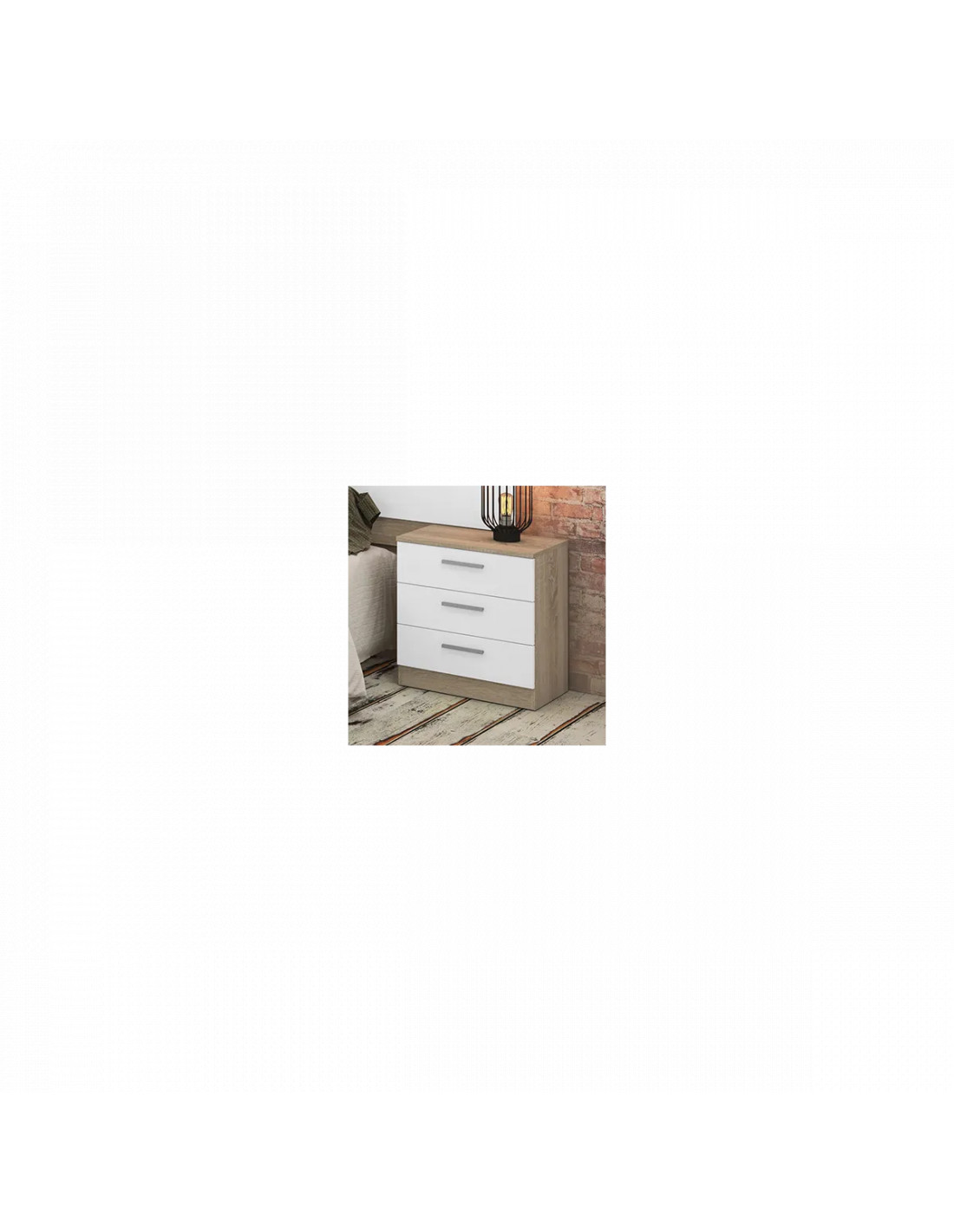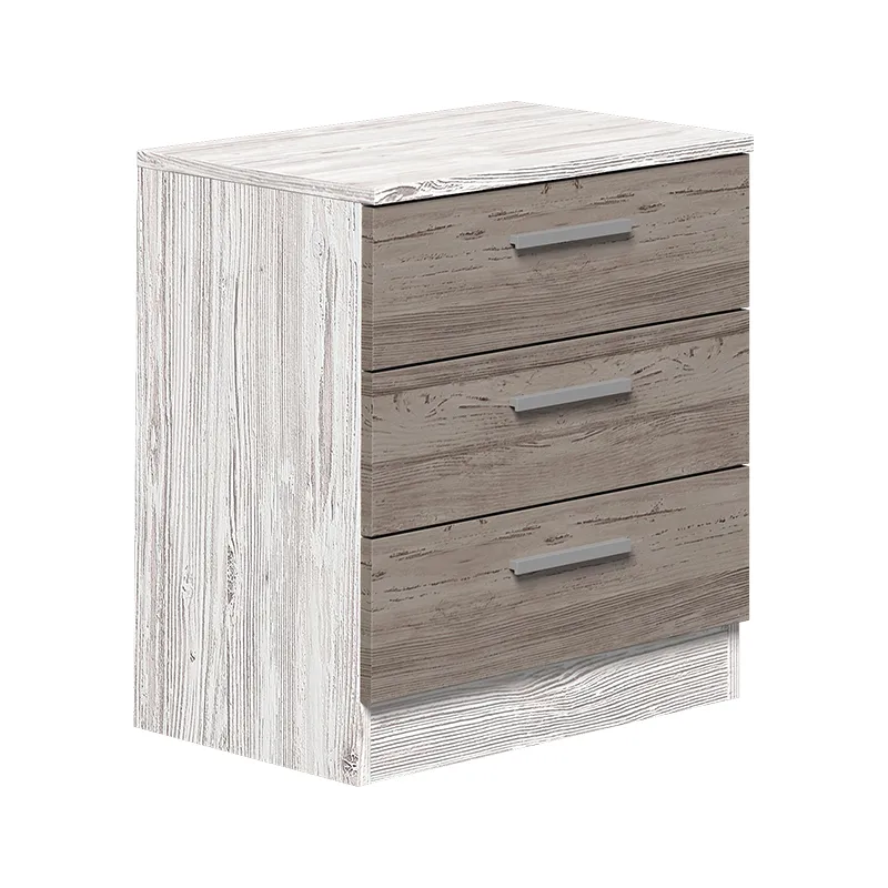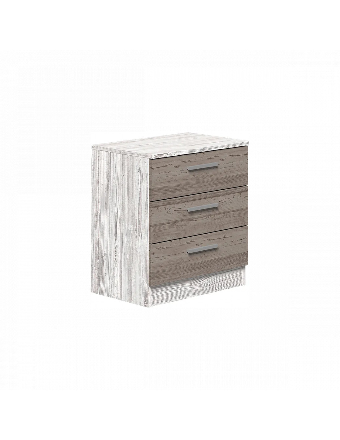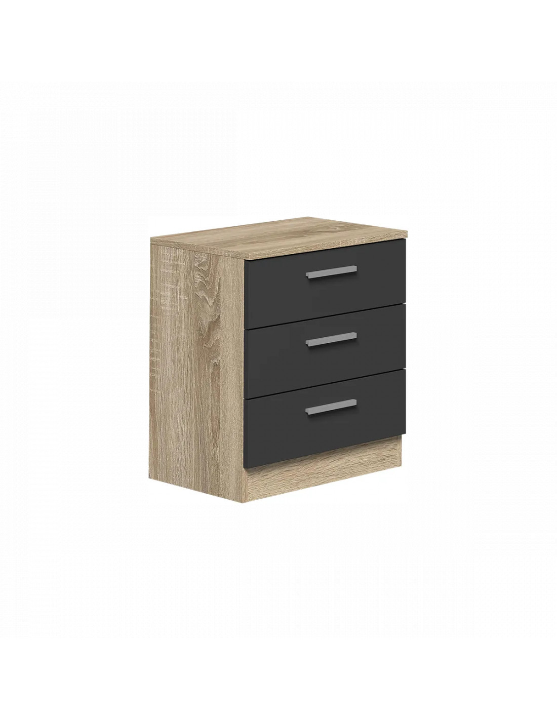 Mesita de noche bicolor con tres cajones combina con toda la serie de dormitorios de matrimonio Monika. una mesita moderna y resistente. Esta fabricada con melamina de alta calidad.