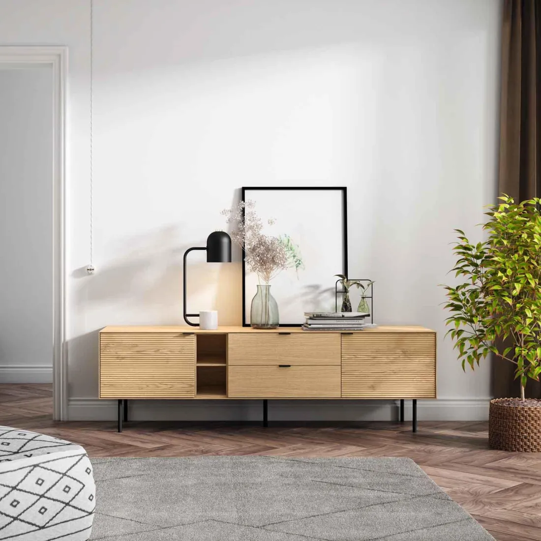 El mueble de TV TULSA de 180 cm combina diseño contemporáneo y calidez natural en una pieza funcional y estética. Con dos puertas laterales y dos cajones centrales, además de un hueco abierto, ofrece múltiples soluciones de almacenaje para mantener el orden sin sacrificar estilo.