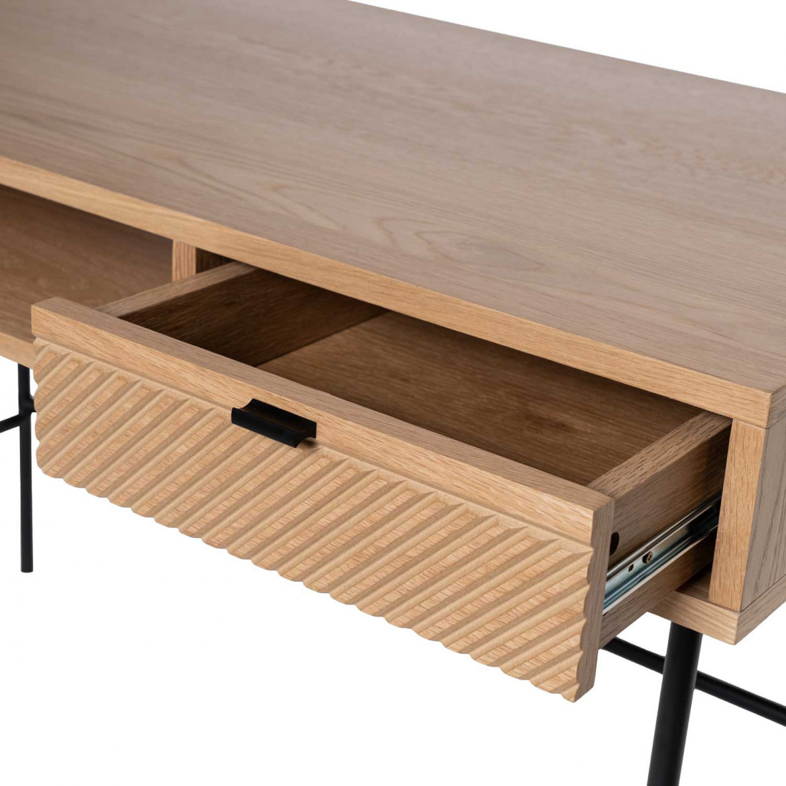 Confeccionado en roble y complementado con patas metálicas en un elegante acabado negro, esta pieza combina una estética sobria con un carácter atemporal. Su diseño limpio y equilibrado permite que se integre con facilidad en una amplia variedad de estilos decorativos, que van desde lo industrial hasta el minimalista, aportando un toque de sofisticación discreta.
