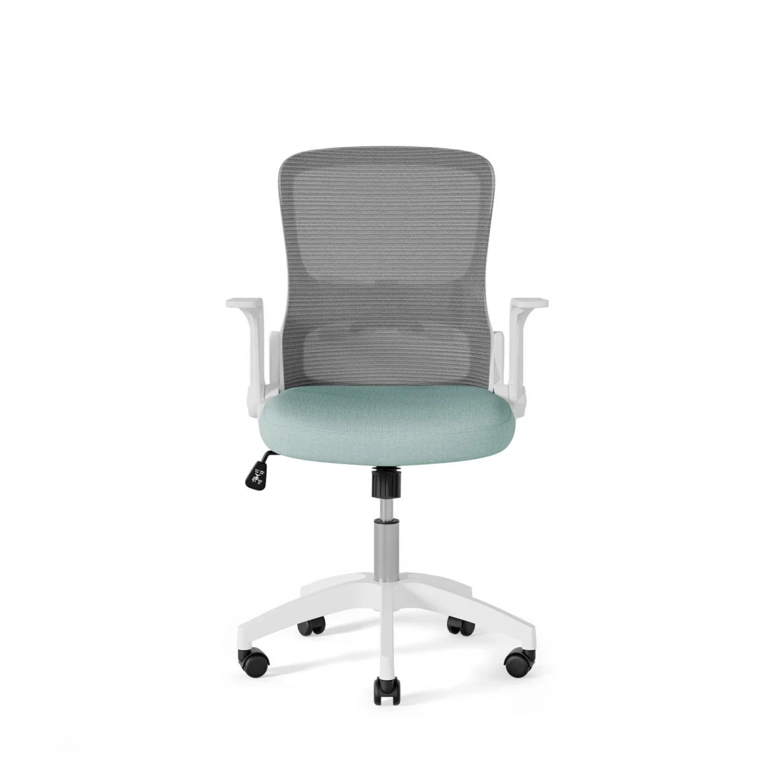 Con líneas depuradas y detalles ergonómicos, destaca por su asiento tapizado y una estructura metálica en tonos blanco y gris, que le confieren un toque elegante y moderno. Su respaldo de malla transpirable garantiza frescura incluso en jornadas laborales prolongadas, evitando la acumulación de calor.