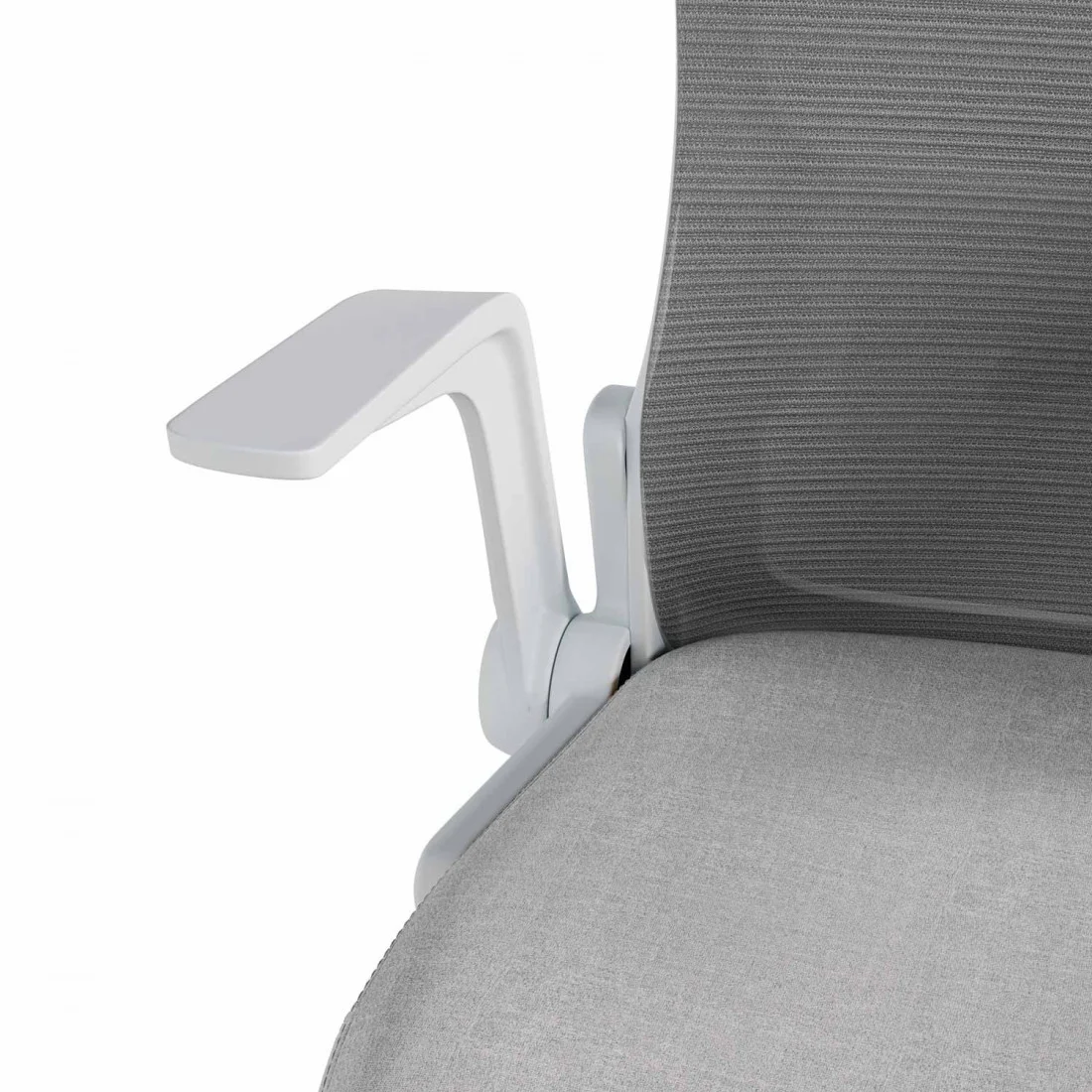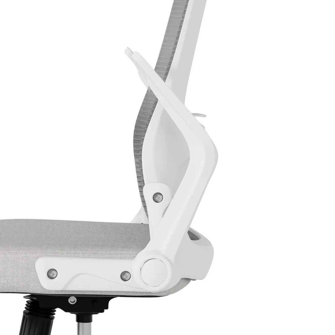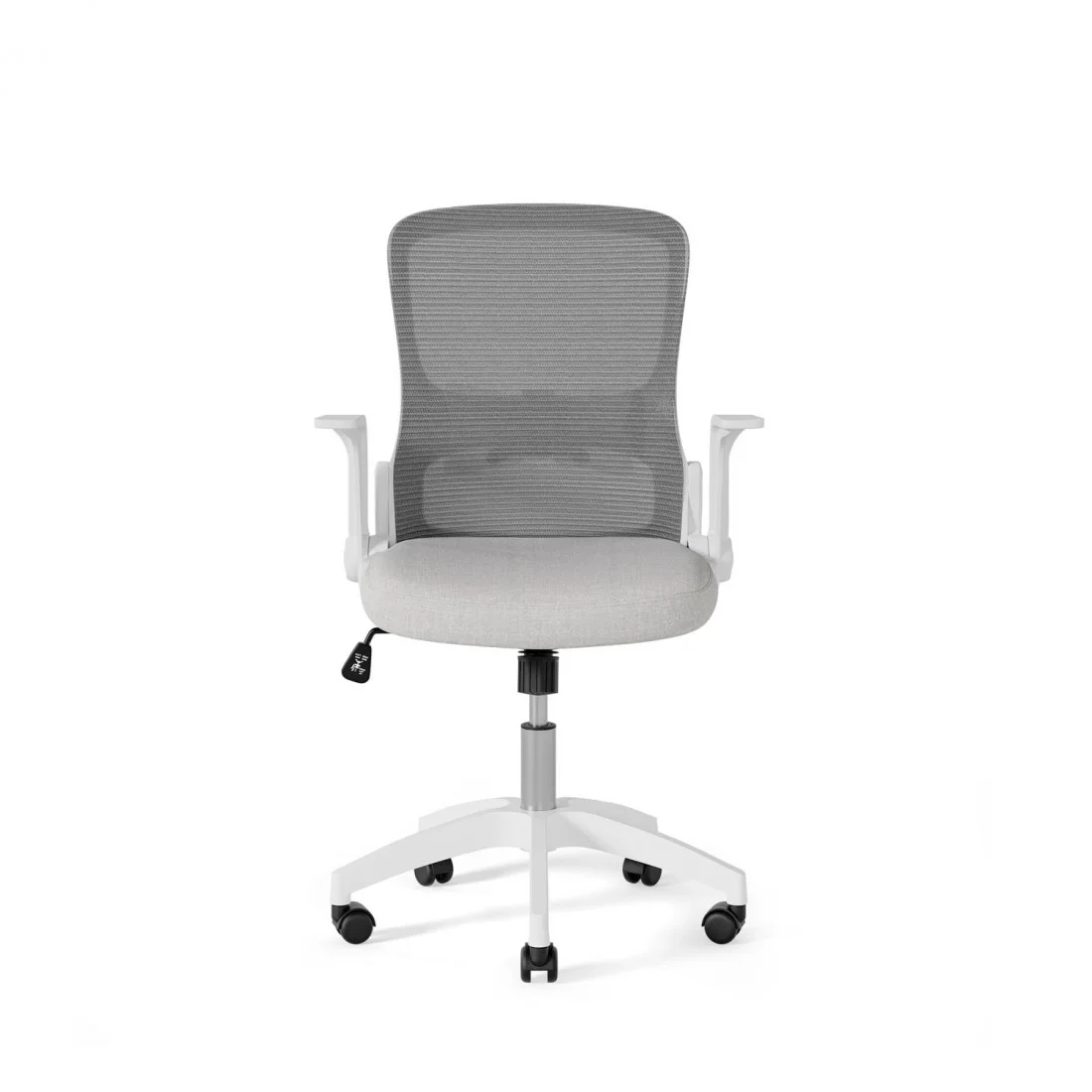 Con líneas depuradas y detalles ergonómicos, destaca por su asiento tapizado y una estructura metálica en tonos blanco y gris, que le confieren un toque elegante y moderno. Su respaldo de malla transpirable garantiza frescura incluso en jornadas laborales prolongadas, evitando la acumulación de calor.