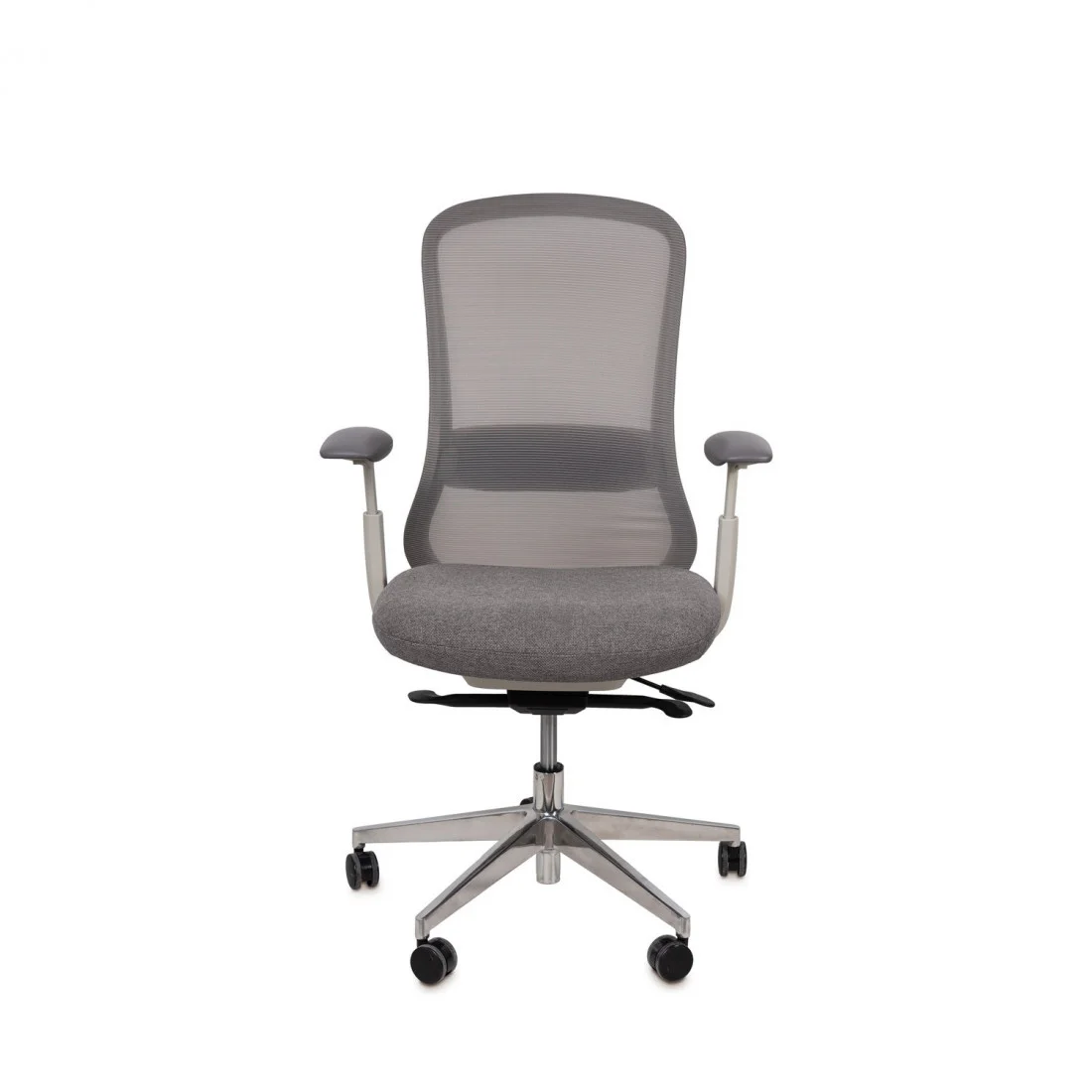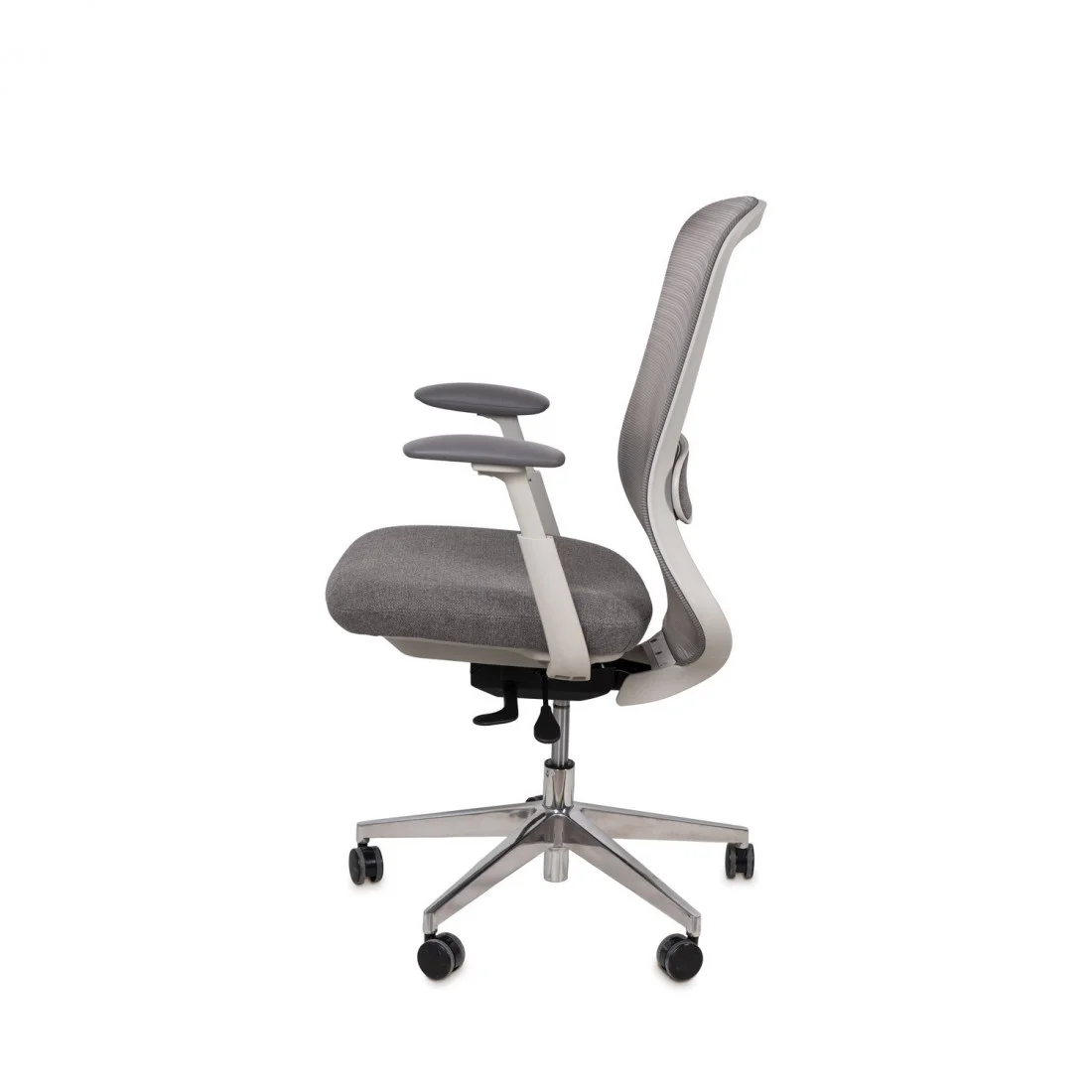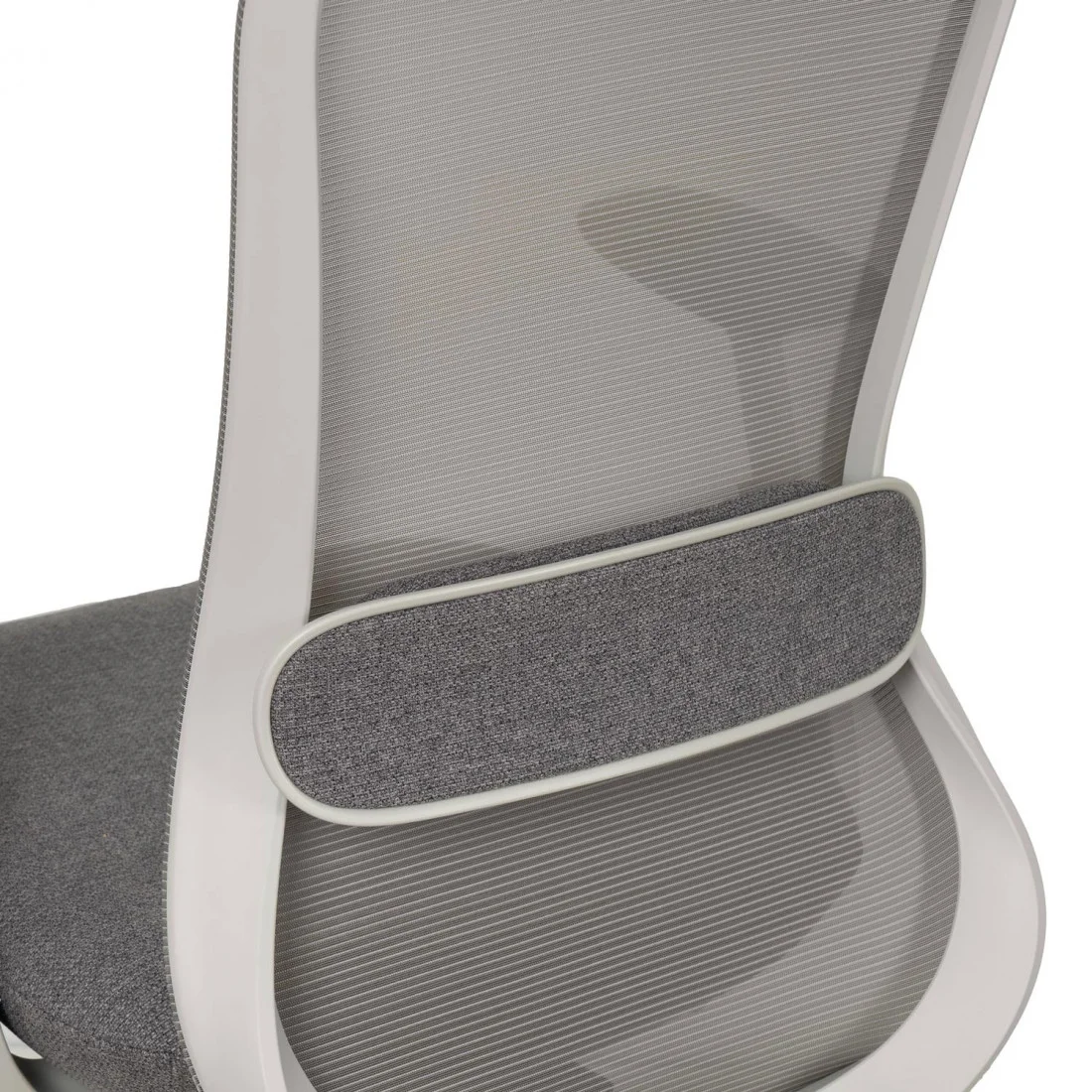 El tapizado del asiento y el apoyo lumbar presentan un acabado uniforme que aporta un toque sofisticado, armonizando perfectamente con los tonos grises y metálicos de su estructura.