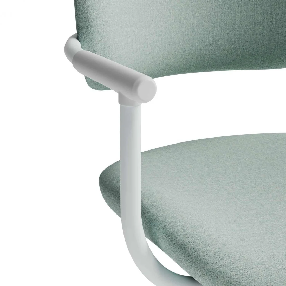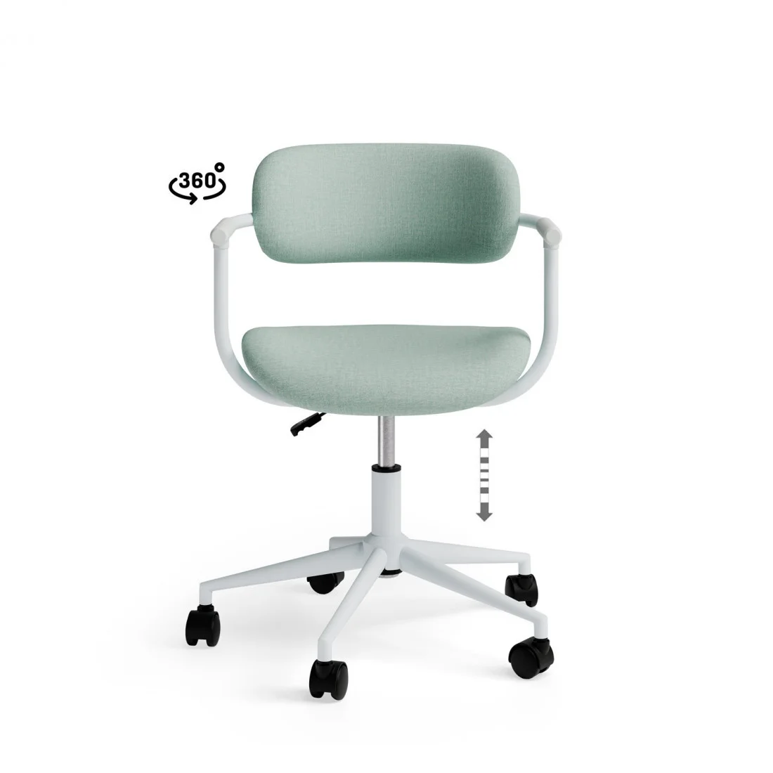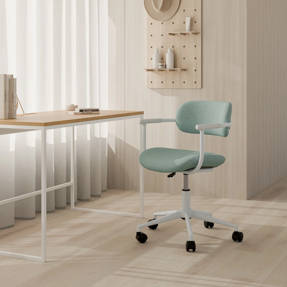 Su estructura minimalista en color blanco se complementa con un tapizado disponible en gris, mostaza o menta, colores que aportan una estética limpia, contemporánea y adaptable a diferentes estilos de decoración. Su forma curvilínea está diseñada para ajustarse de manera natural a la espalda, ofreciendo un soporte ergonómico que prioriza la comodidad durante largas horas de uso.