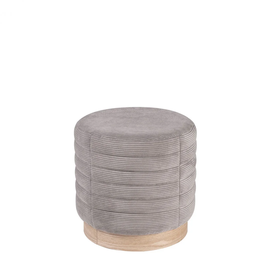 El puff SAUL destaca por su tapizado efecto terciopelo con un sutil patrón rayado que le otorga un aire sofisticado y atractivo. En contraste, la base de madera de pino natural refuerza su carácter cálido y aporta un toque orgánico, integrándolo perfectamente en decoraciones contemporáneas o escandinavas.