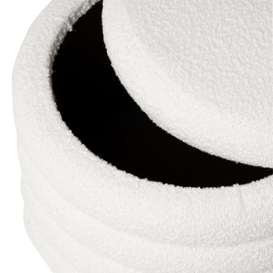 Su estructura cilíndrica esconde un práctico secreto: la tapa superior se retira con facilidad, revelando un compartimento interior perfecto para almacenar mantas, revistas o pequeños objetos del día a día. Esta funcionalidad lo convierte en una opción ideal para espacios reducidos o ambientes que apuestan por el orden sin renunciar al estilo.