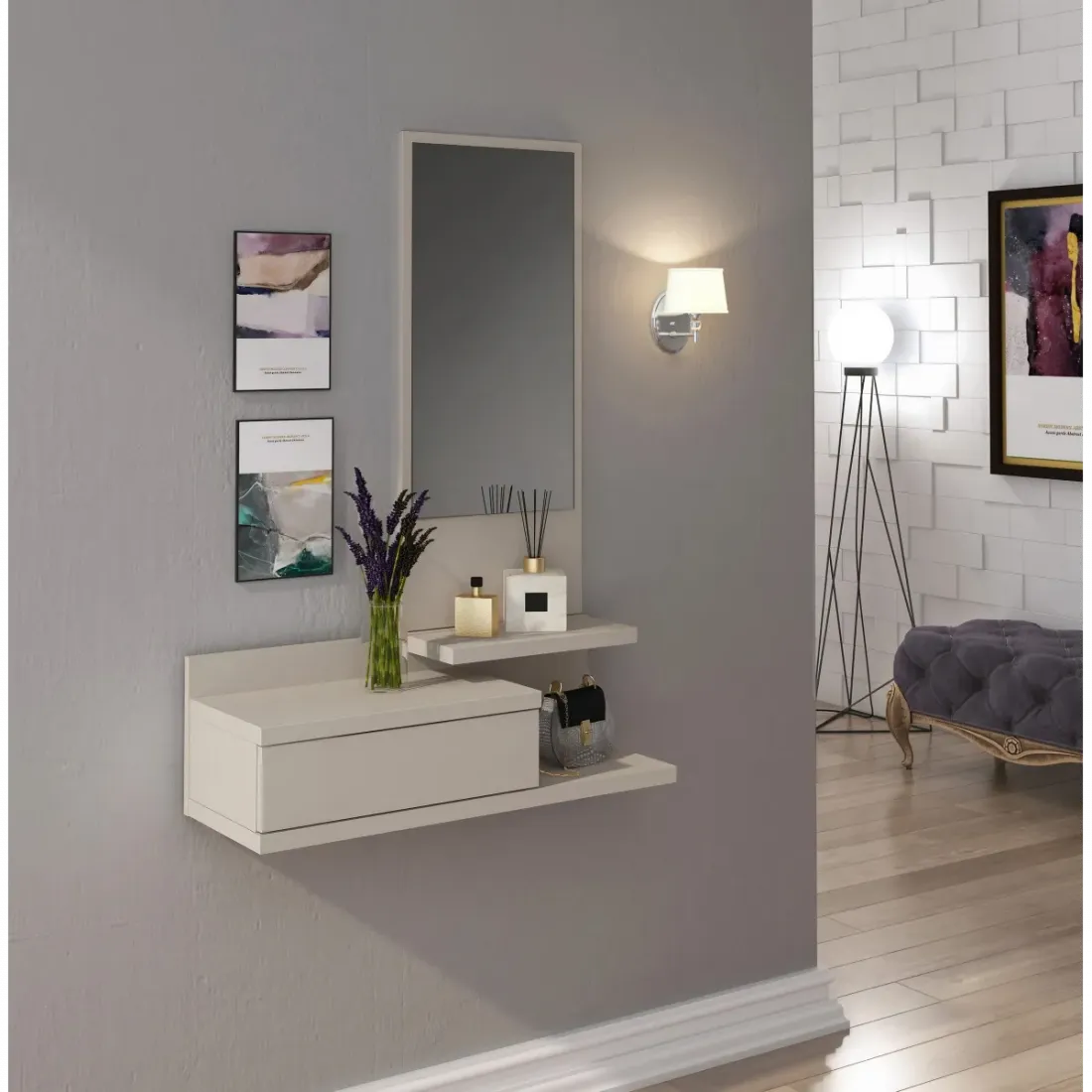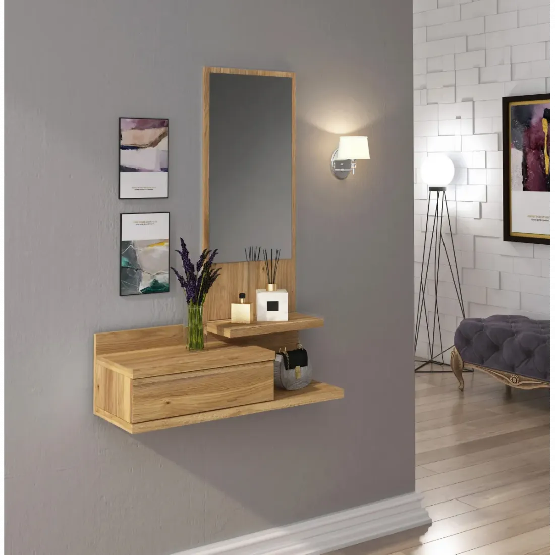 RECIBIDOR VERTICAL MOD. AURA BEIGE O ROBLE MAUVELLA CON CAJÓN Y ESPEJO