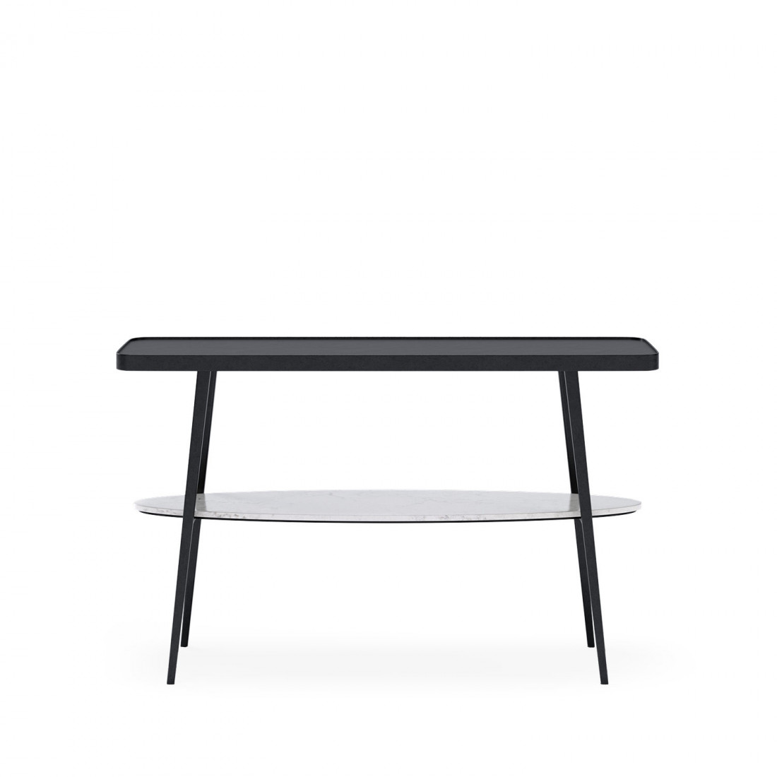 La consola ELVAS está formada por dos estructuras: una con dos cajones amplios y otra con un estante abierto que abarca todo el largo de la consola, ofreciendo espacio adicional para almacenamiento o exhibición.