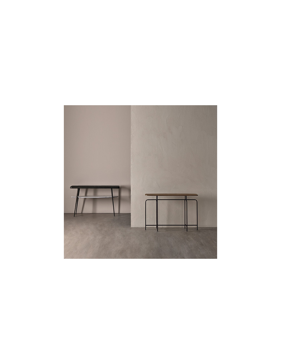 La consola YURI combina la calidez de la madera de roble con la fuerza visual de una estructura metálica negra, dando como resultado una pieza sobria y contemporánea.