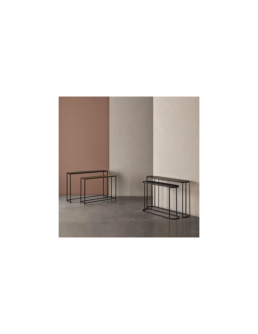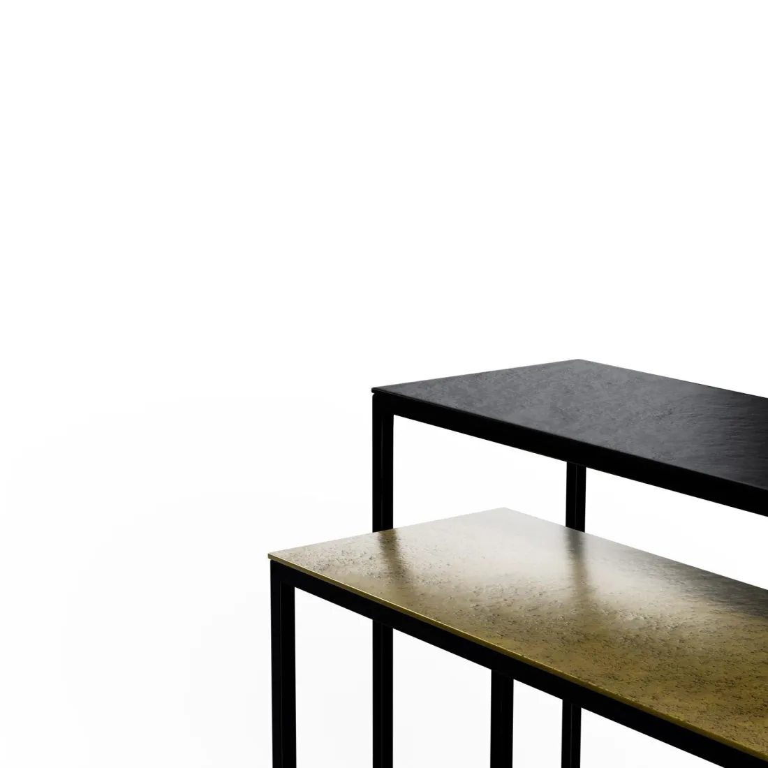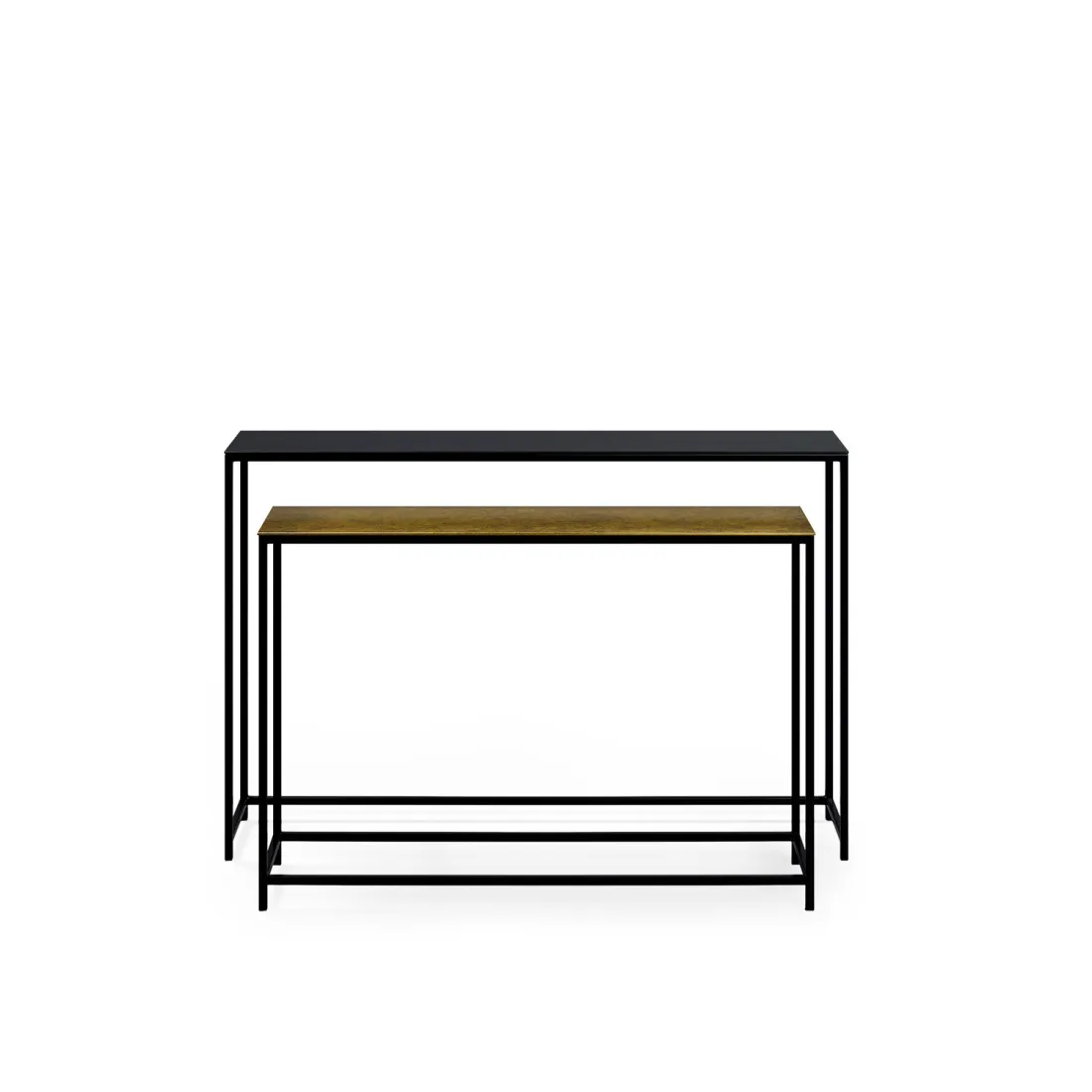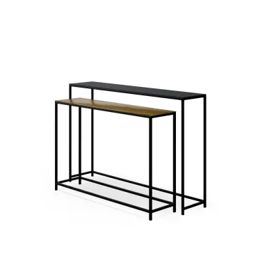 El set de consolas VEDA destaca por su diseño ligero y elegante, ideal para recibidores con personalidad. Cada pieza combina una tapa de aluminio con acabado en negro o dorado envejecido.