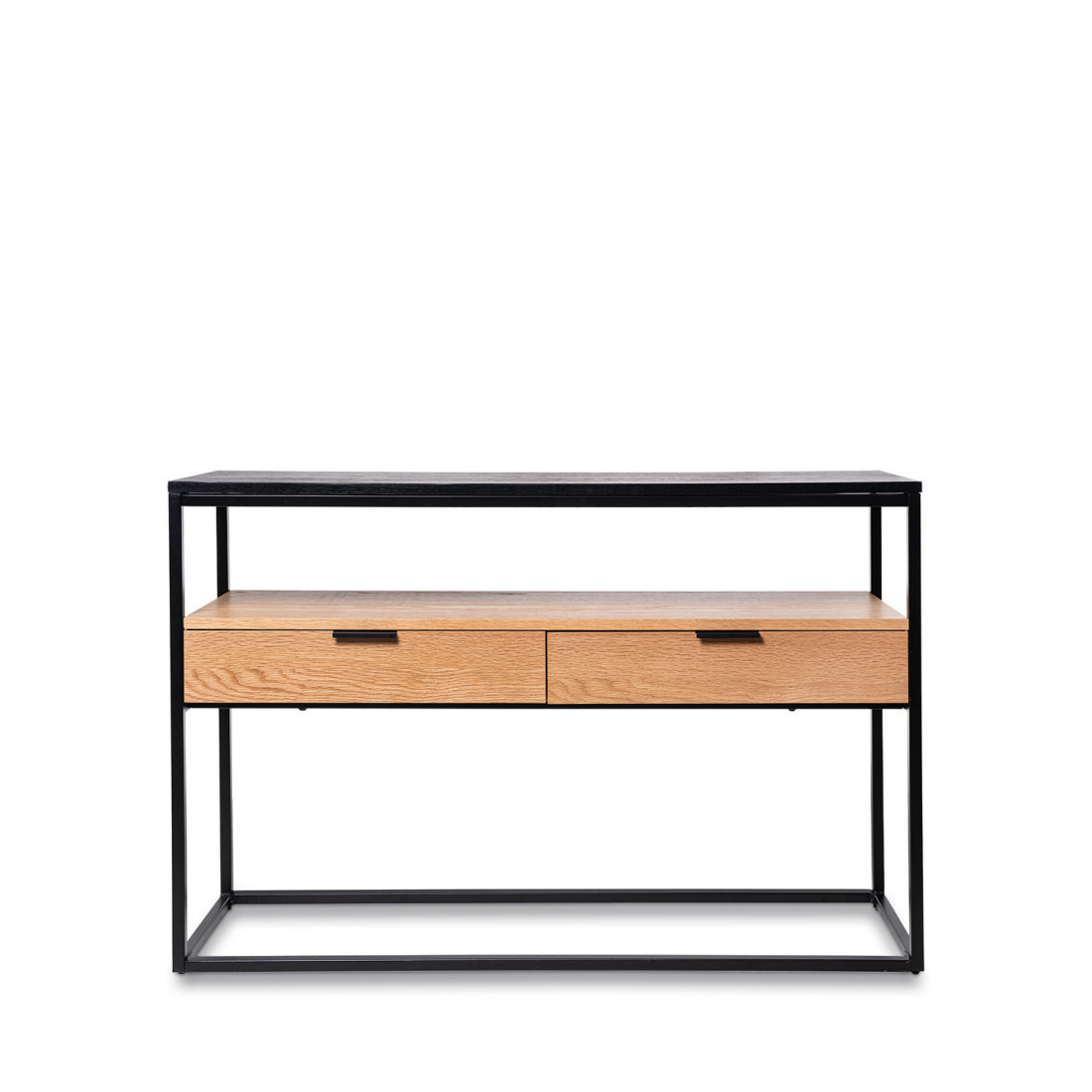 La consola YURI combina la calidez de la madera de roble con la fuerza visual de una estructura metálica negra, dando como resultado una pieza sobria y contemporánea.
