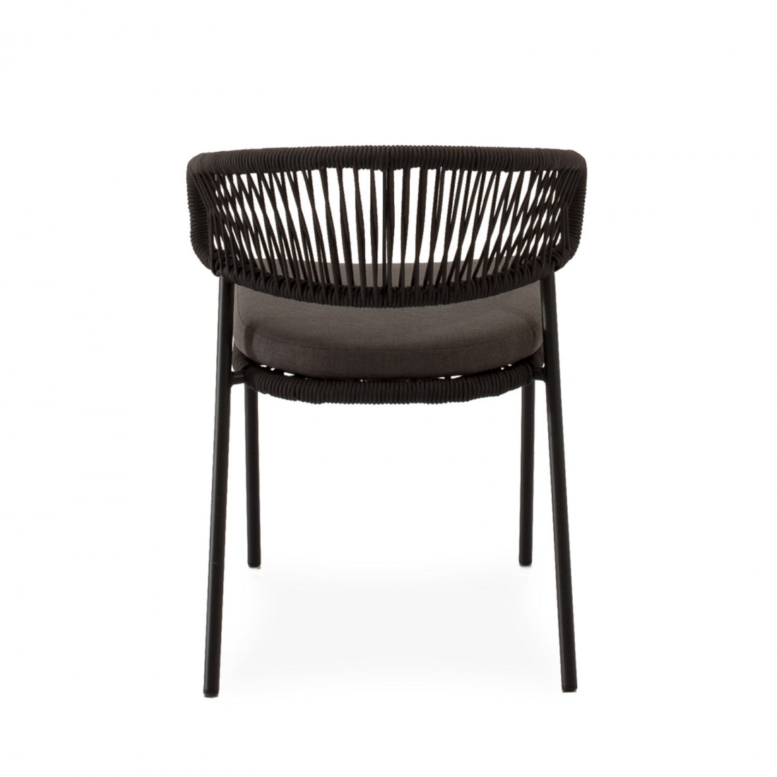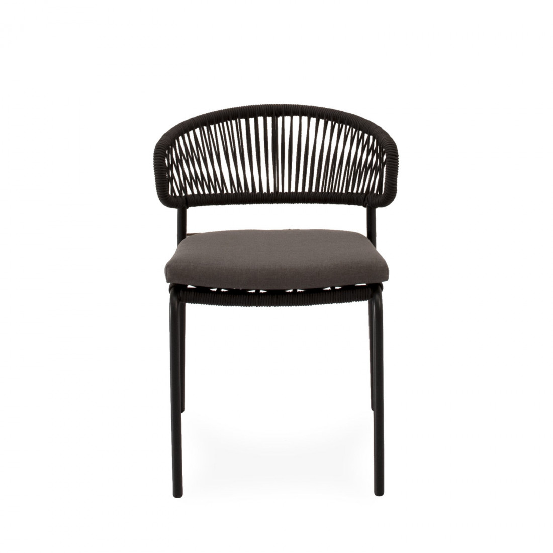 Su estructura de cuerda resistente y patas de acero perfeccionado para resistir al entorno exterior, ofrecen un equilibrio perfecto entre estabilidad y estilo, mientras que el asiento acolchado en poliéster proporciona un confort duradero. El respaldo curvo, además de sumar un toque decorativo discreto, favorece una postura cómoda y natural.