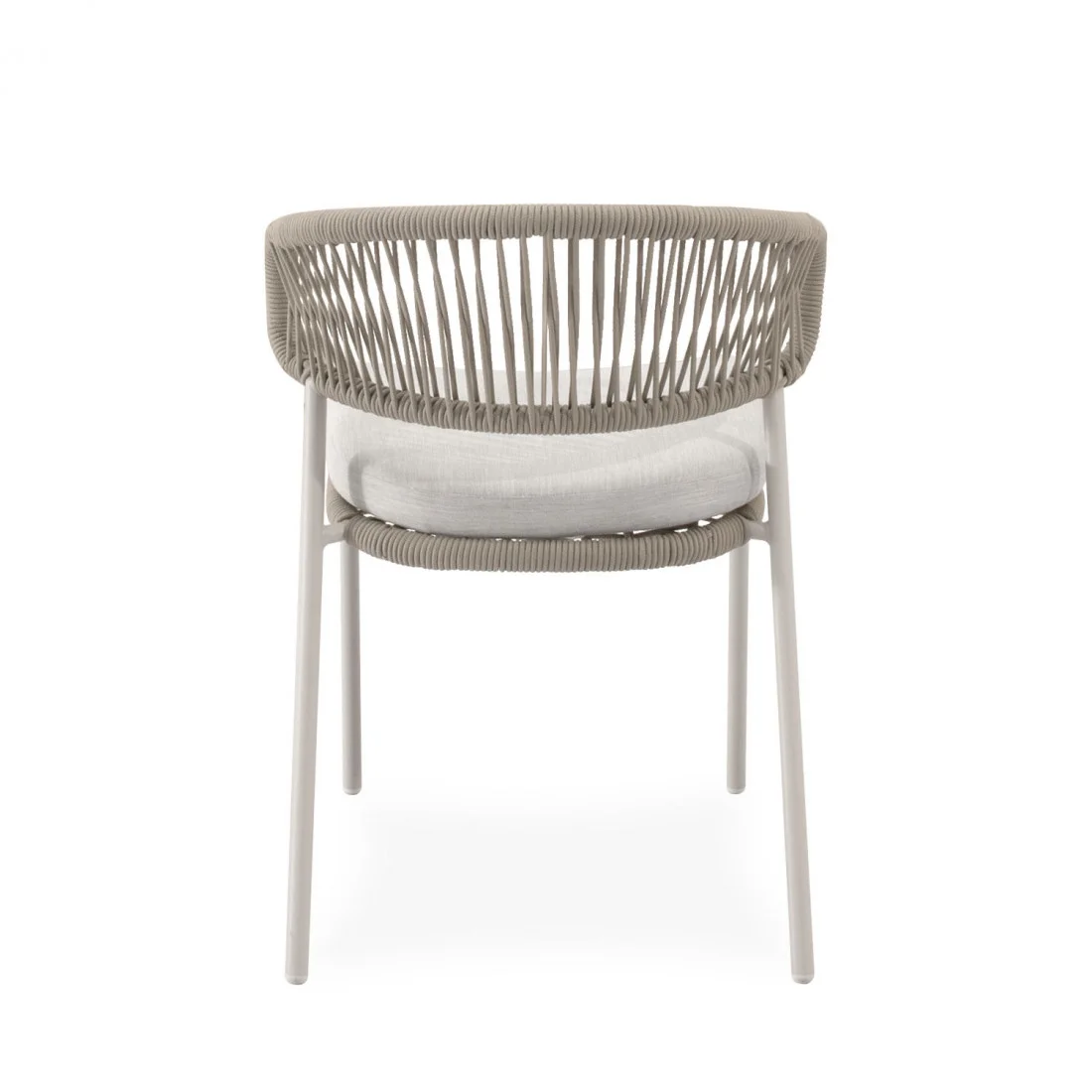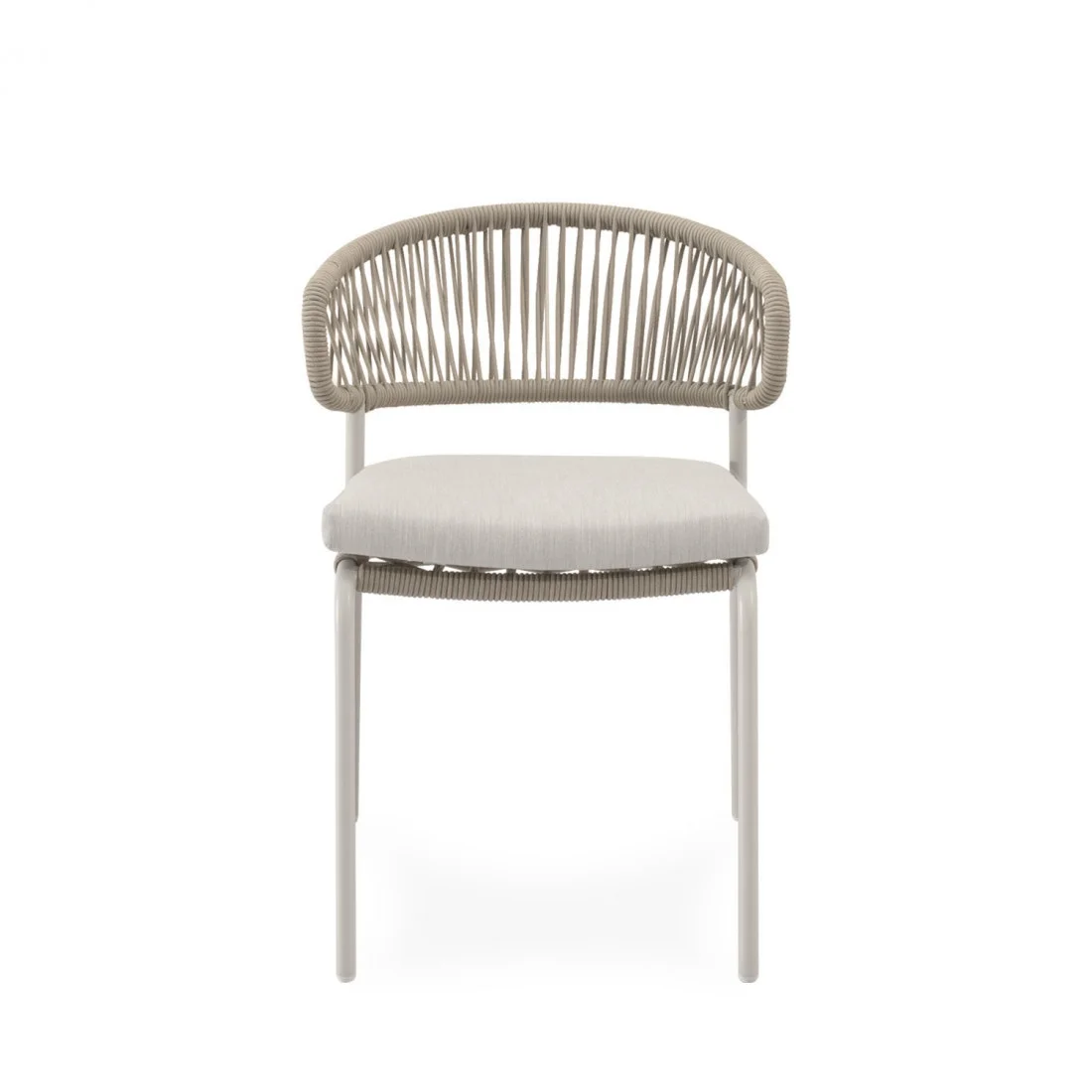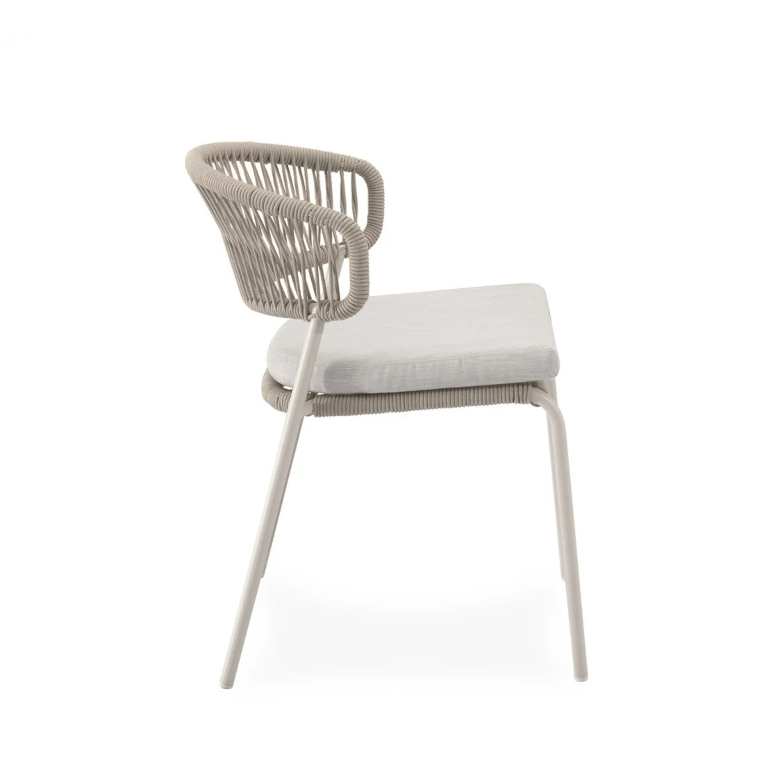 Su estructura de cuerda resistente y patas de acero perfeccionado para resistir al entorno exterior, ofrecen un equilibrio perfecto entre estabilidad y estilo, mientras que el asiento acolchado en poliéster proporciona un confort duradero. El respaldo curvo, además de sumar un toque decorativo discreto, favorece una postura cómoda y natural.