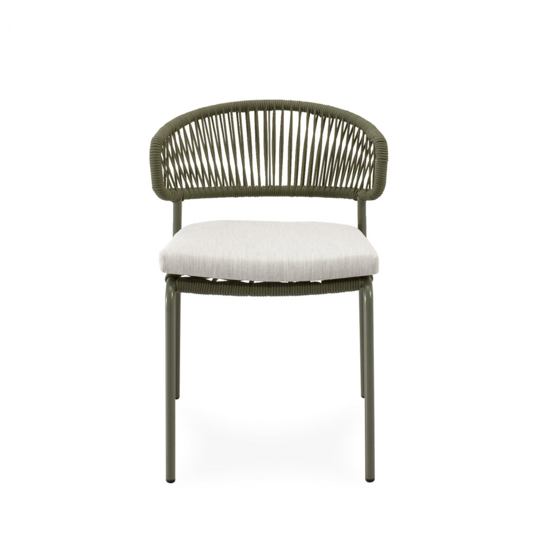 Su estructura de cuerda resistente y patas de acero perfeccionado para resistir al entorno exterior, ofrecen un equilibrio perfecto entre estabilidad y estilo, mientras que el asiento acolchado en poliéster proporciona un confort duradero. El respaldo curvo, además de sumar un toque decorativo discreto, favorece una postura cómoda y natural.