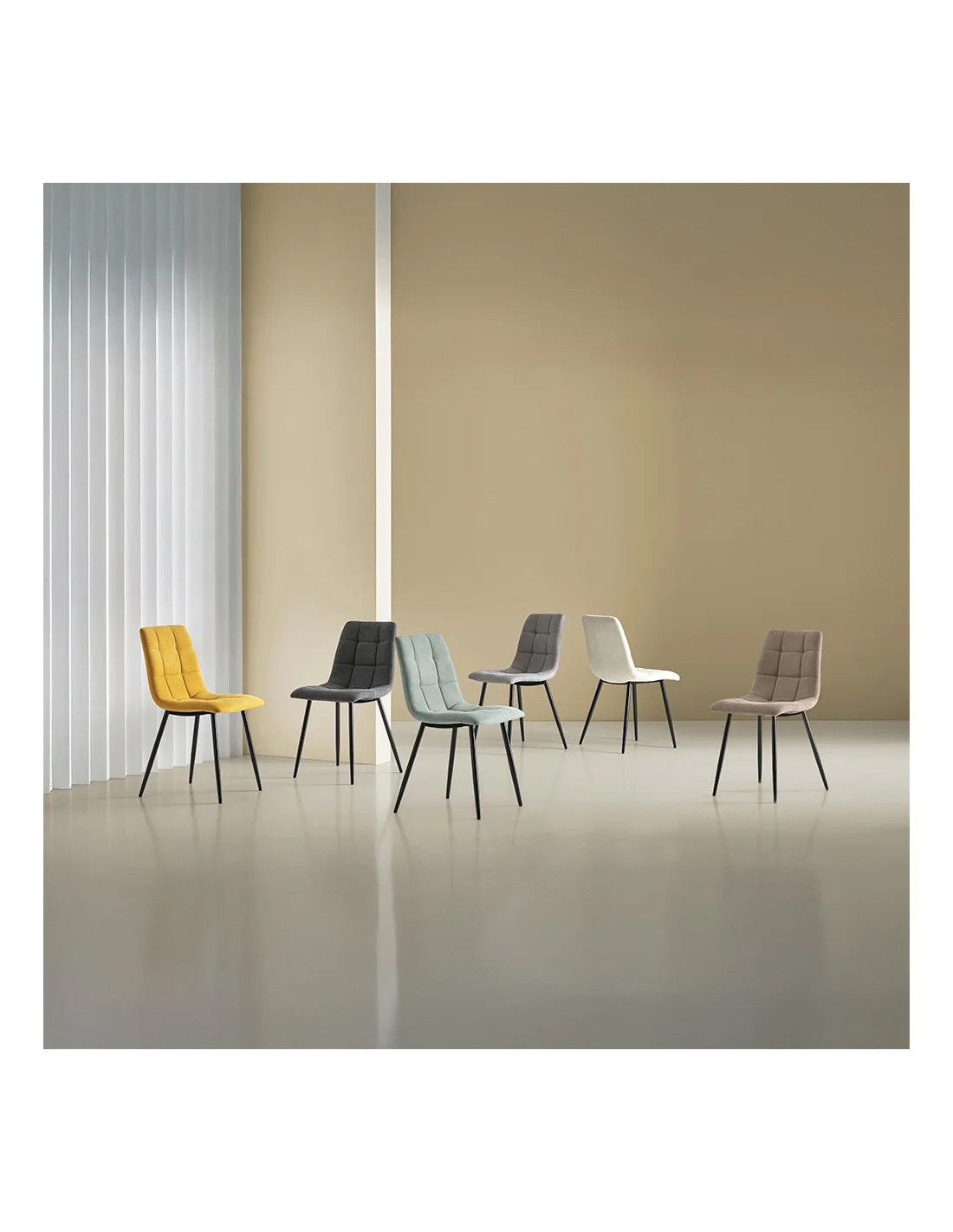 La textura cuadrada de su tejido, confeccionado en 100% poliéster, no solo añade un toque de sofisticación, sino que también crea un contraste elegante con las suaves formas de la silla.
