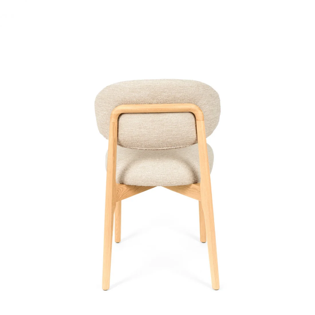 El respaldo y el asiento, tapizados en tejido suave y disponible en tres tonos neutros —beige, verde y taupe—, invitan al confort sin perder de vista la estética. Pero es su parte trasera la que revela un detalle único: una estructura de madera vista que enmarca el respaldo con un diseño curvo y artesanal, convirtiendo la silla en un objeto decorativo incluso cuando se observa desde atrás.