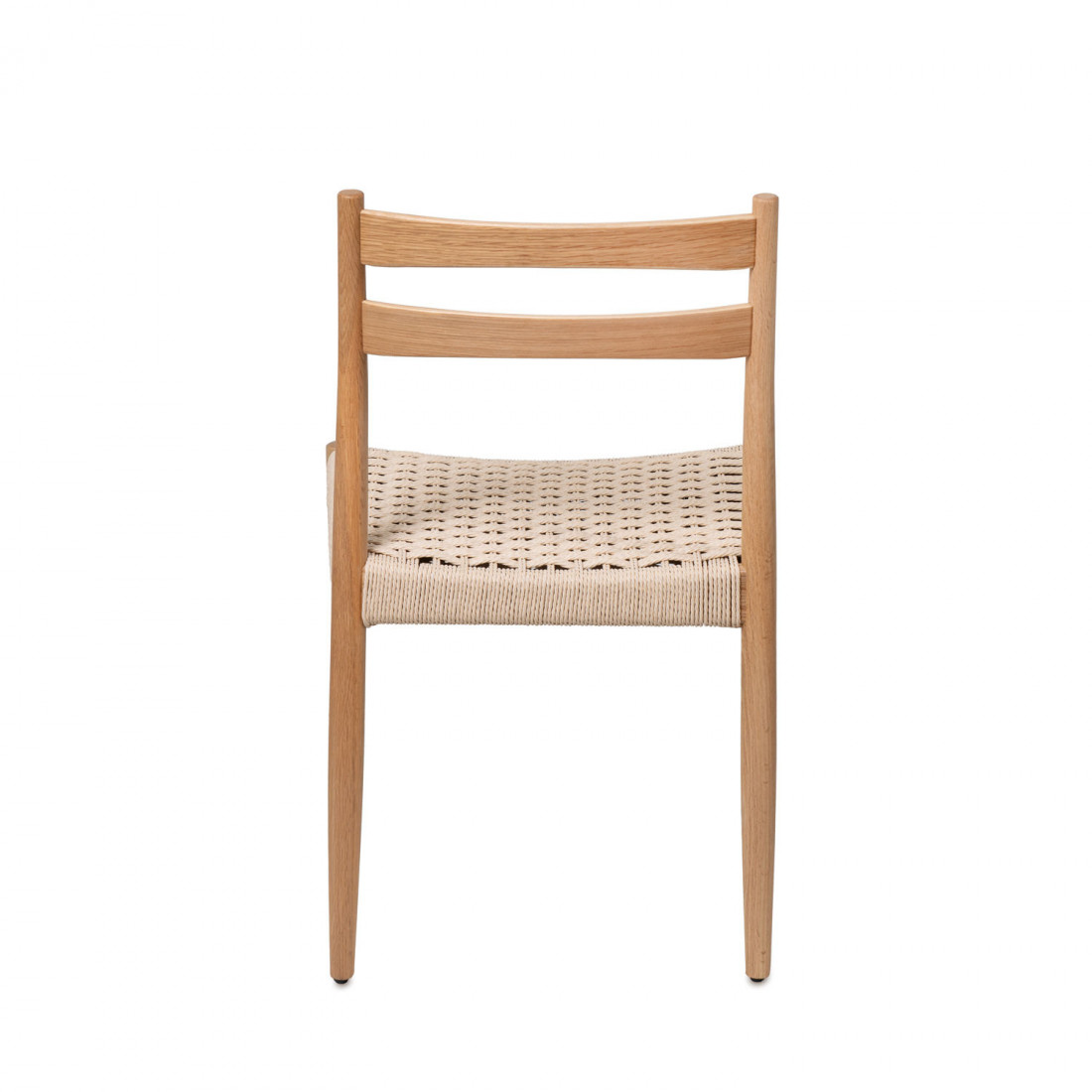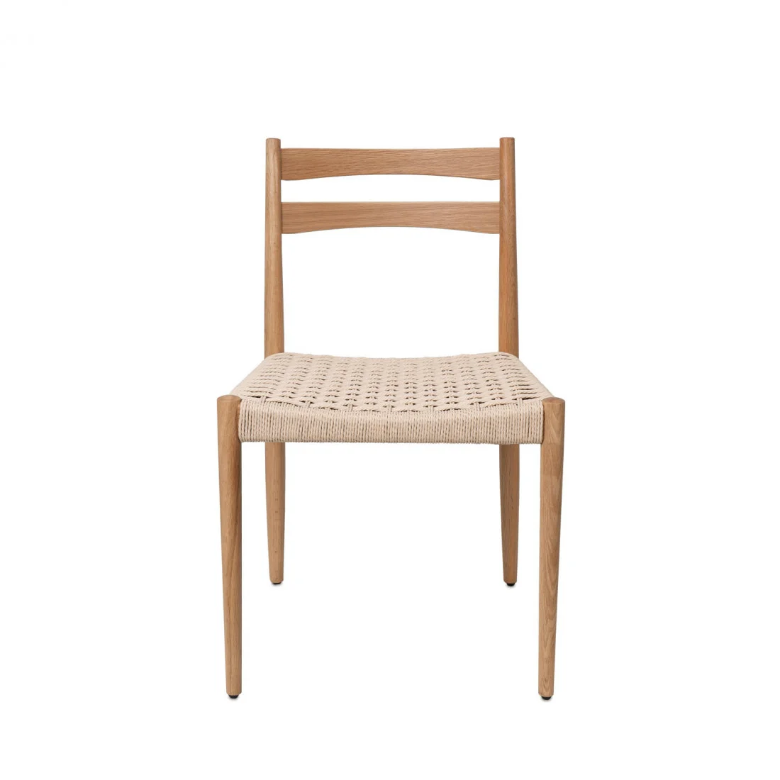 El diseño de la BONNIE resalta gracias a su estructura en madera de roble de tono natural, un material que aporta autenticidad y durabilidad. A ello se suma su asiento tejido en cuerda de color natural, un elemento que no solo añade una sensación de calidez y artesanía, sino que también realza el atractivo acogedor y artesanal del diseño.
