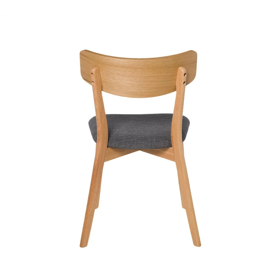 Su estructura está hecha de chapa natural de roble, lo que le confiere un aspecto elegante y actual. El asiento, tapizado en tela de color gris oscuro (100% poliéster), añade un contraste sofisticado y contemporáneo.