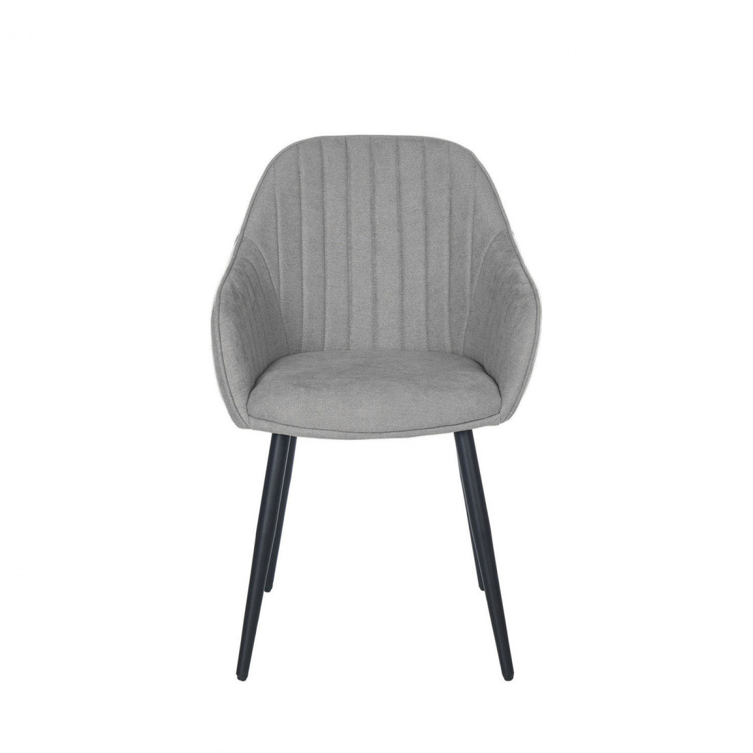Su estructura acolchada con reposabrazos y respaldo alto, junto con su tejido en color gris claro con grabado en líneas verticales, le confiere un estilo elegante y sofisticado.