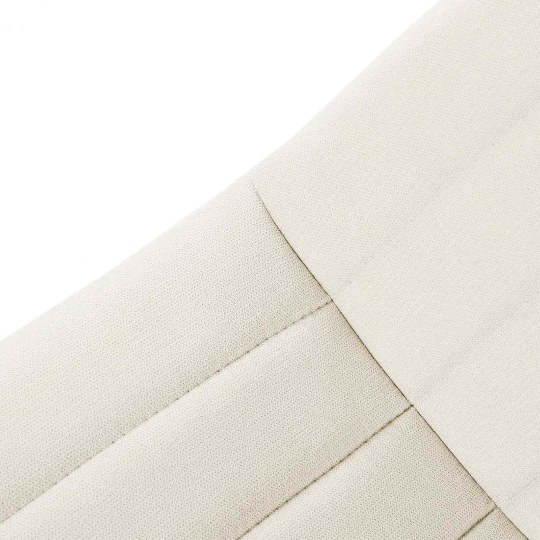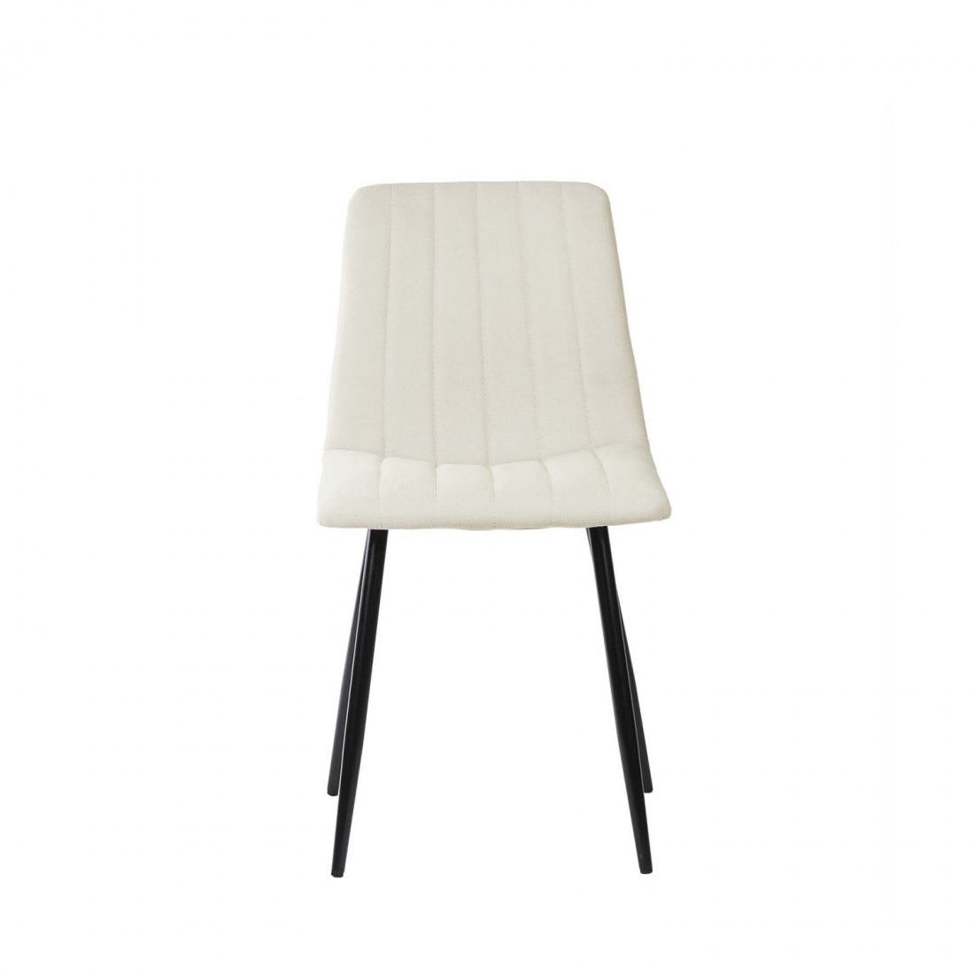 Silla metálica de diseño minimalista y elegante. El asiento y el respaldo están acolchados y presentan un tapizado en tela beige con costuras verticales que crean una textura acanalada, añadiendo tanto comodidad como interés visual.