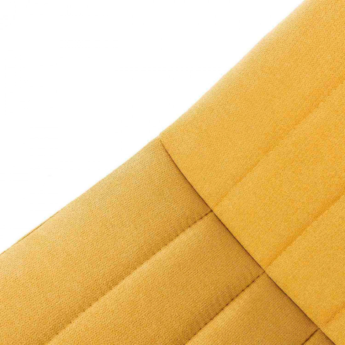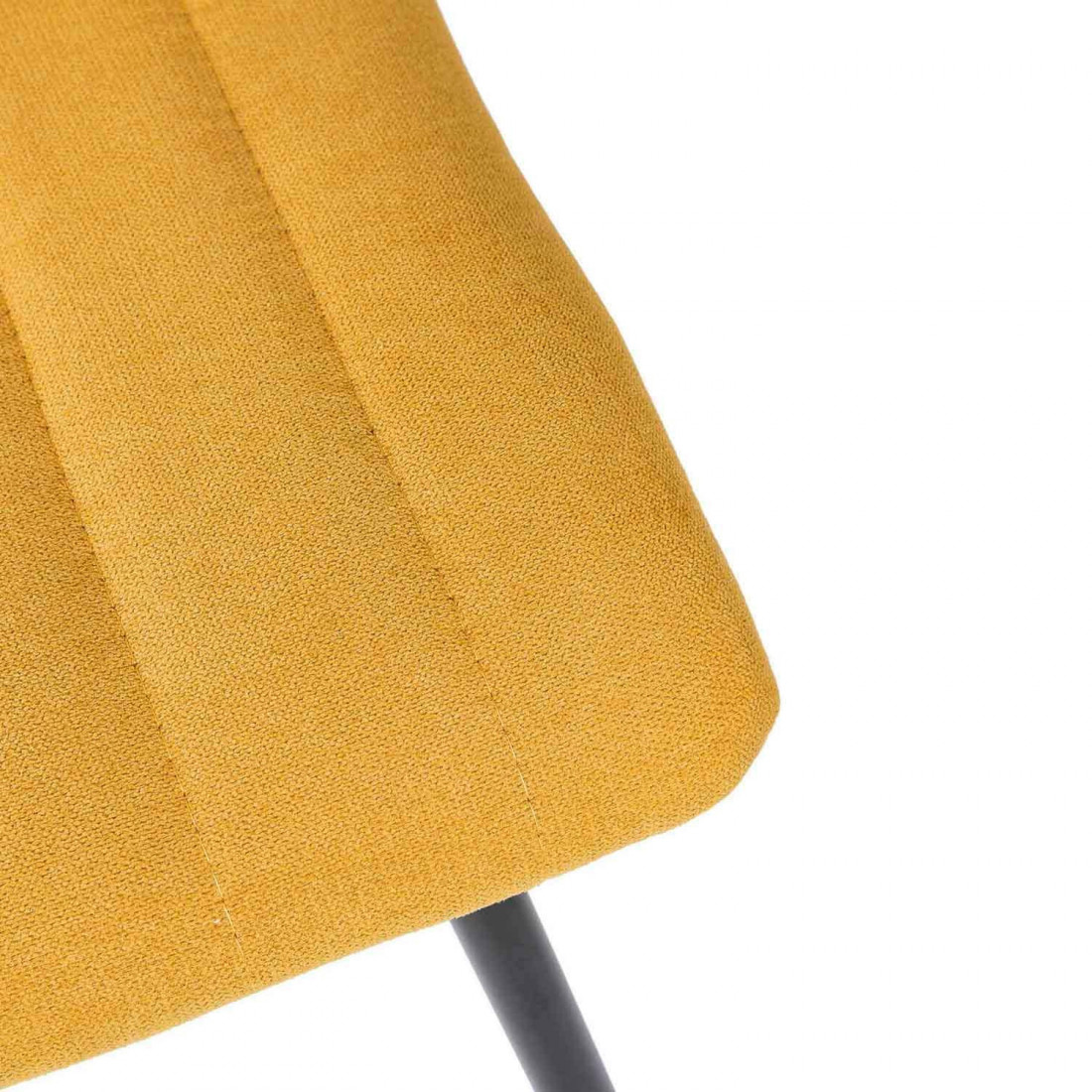 Silla metálica de diseño minimalista y elegante. El asiento y el respaldo están acolchados y presentan un tapizado en tela mostaza con costuras verticales que crean una textura acanalada, añadiendo tanto comodidad como interés visual.