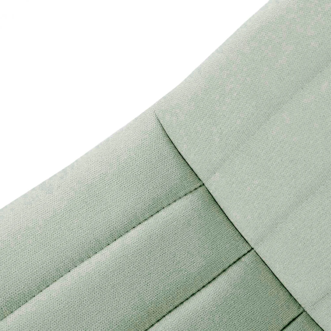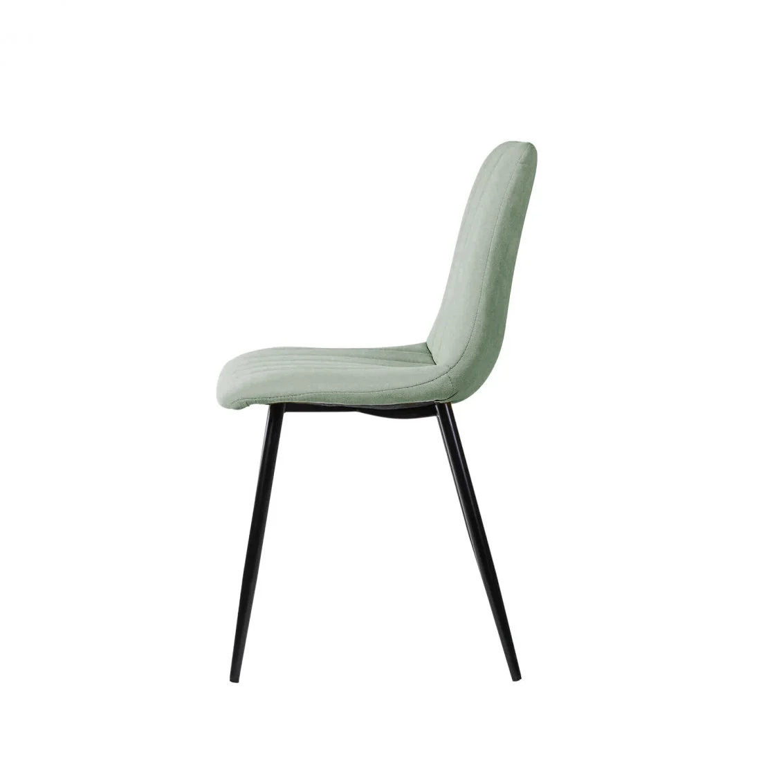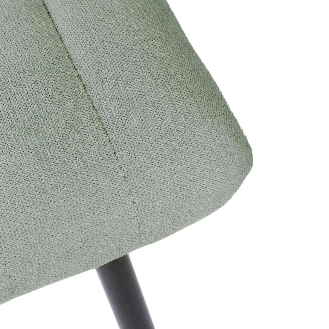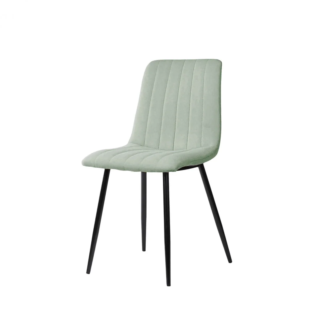 Silla metálica de diseño minimalista y elegante. El asiento y el respaldo están acolchados y presentan un tapizado en tela menta con costuras verticales que crean una textura acanalada, añadiendo tanto comodidad como interés visual.