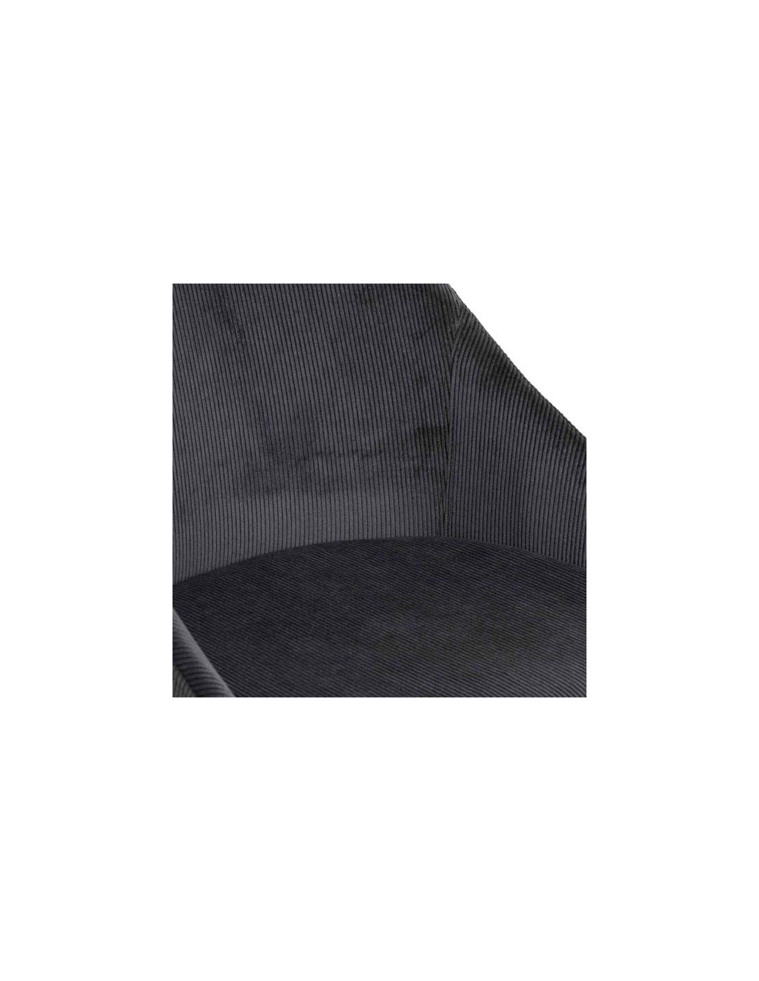 La silla MACIE está tapizada en un suave tejido de pana en color gris oscuro, es agradable al tacto y fácil de limpiar, lo que la hace perfecta para el uso diario.