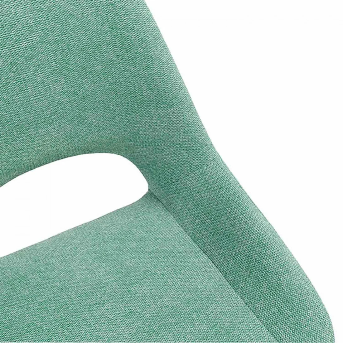 La silla SIMONA se distingue por su apertura en el respaldo, elegantemente enmarcada con metal negro que complementa perfectamente la estructura y las patas.