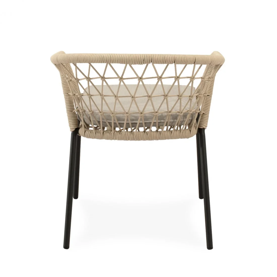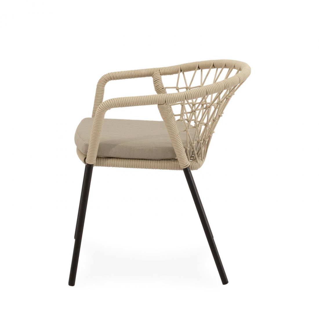 La estructura de la silla SOLENE está compuesta por un entramado de cuerda resistente que envuelve suavemente el respaldo y los reposabrazos, creando un efecto visual atractivo y aportando un soporte ergonómico. Disponible en tonos naturales, permite integrarse en terrazas, jardines o patios, aportando un toque contemporáneo y acogedor.