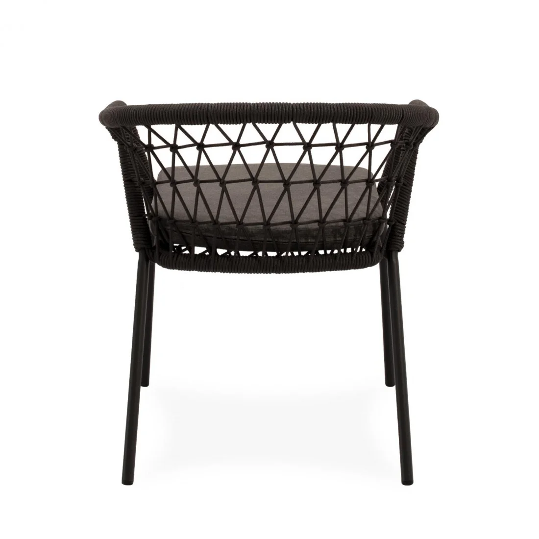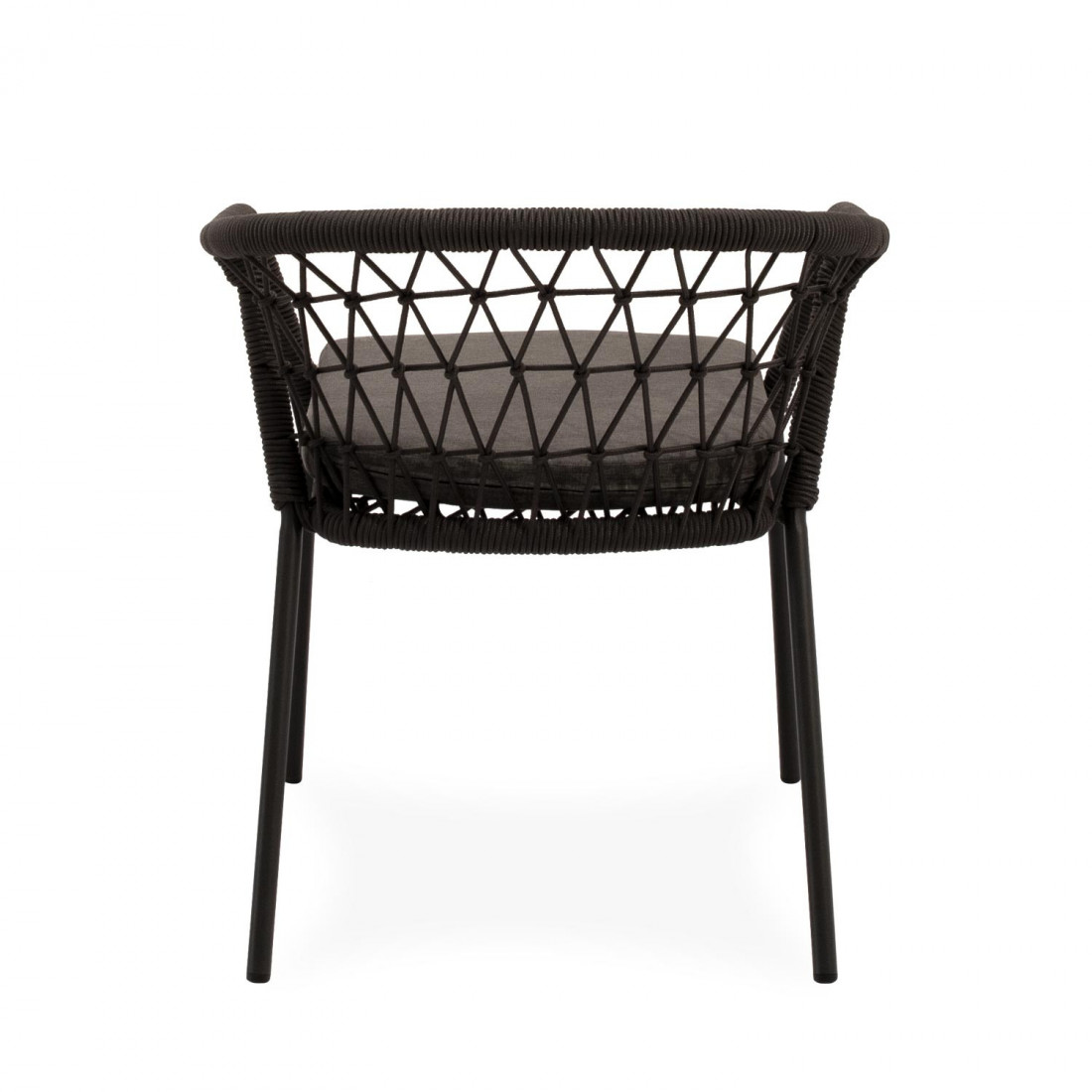 La estructura de la silla SOLENE está compuesta por un entramado de cuerda resistente que envuelve suavemente el respaldo y los reposabrazos, creando un efecto visual atractivo y aportando un soporte ergonómico. Disponible en tonos naturales, permite integrarse en terrazas, jardines o patios, aportando un toque contemporáneo y acogedor.