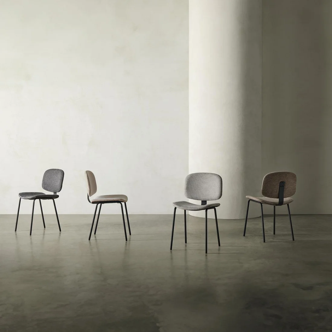 La silla ALESSIA combina su asiento y respaldo tapizados en un tejido texturizado gris claro con una capa exterior que simula antelina, proporcionando una textura suave y agradable al tacto.